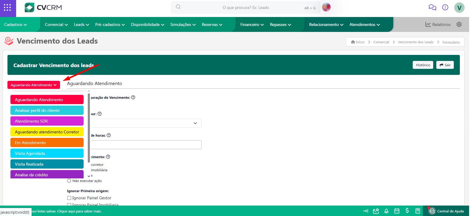 No lado esquerdo da tela serão listadas as etapas do workflow de leads e a configuração do vencimento é feita para cada etapa do Workflow de Leads.