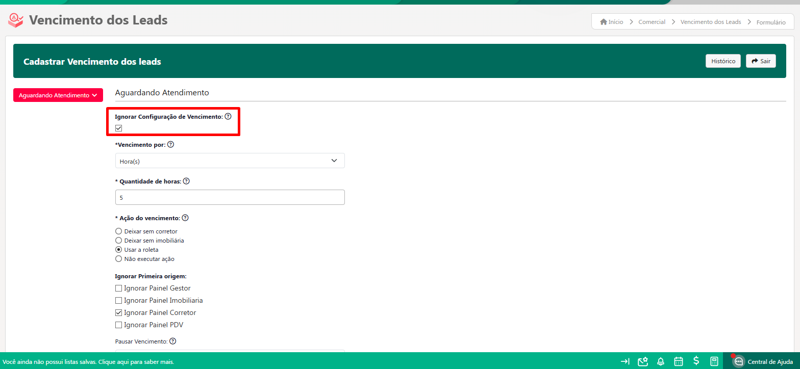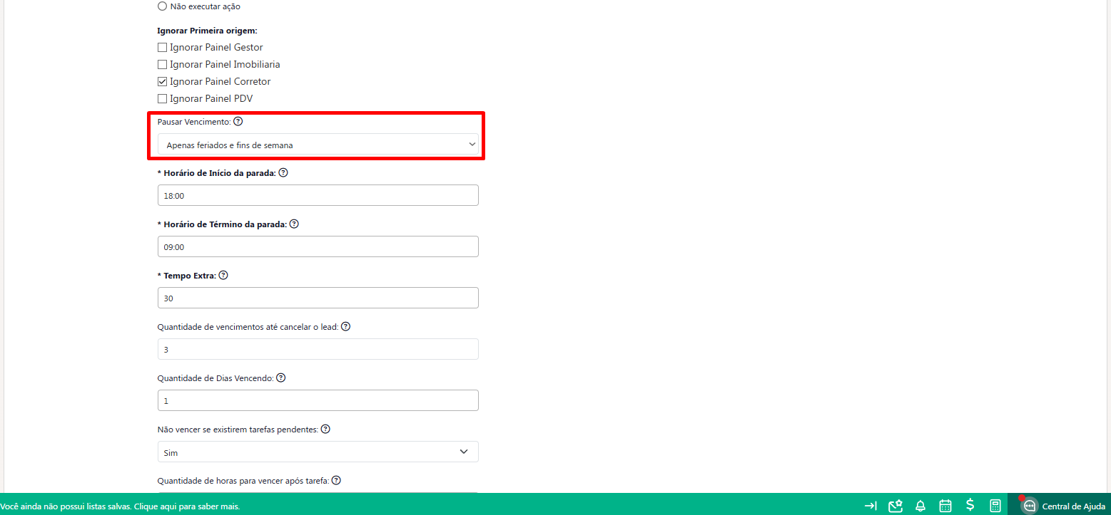 - Ignorar Configuração de Vencimento: se esse campo estiver marcado, as configurações feitas nessa tela serão ignoradas, caso o lead precise recalcular vencimento nessa situação ele ficará “sem vencimento” pois a configuração está sendo ignorada;