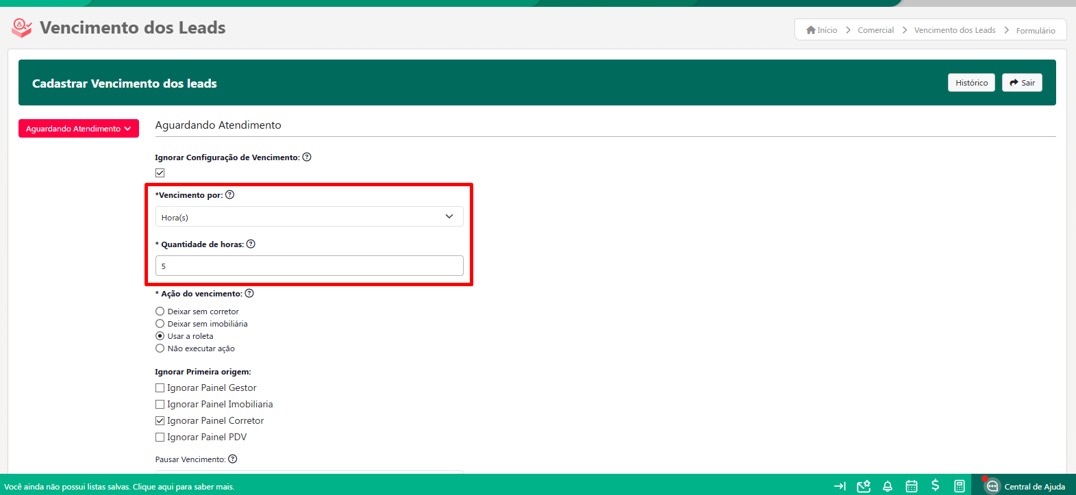 Obs.: assim como no vencimento por hora, o vencimento por minuto ocorre em uma rotina agendada de 5 minutos, ou seja, o vencimento pode se dar dentro dessa janela de 1 a 5 minutos.- Quantidade de horas/minutos: a quantidade de horas/minutos que esse lead poderá passar sem interação até vencer;