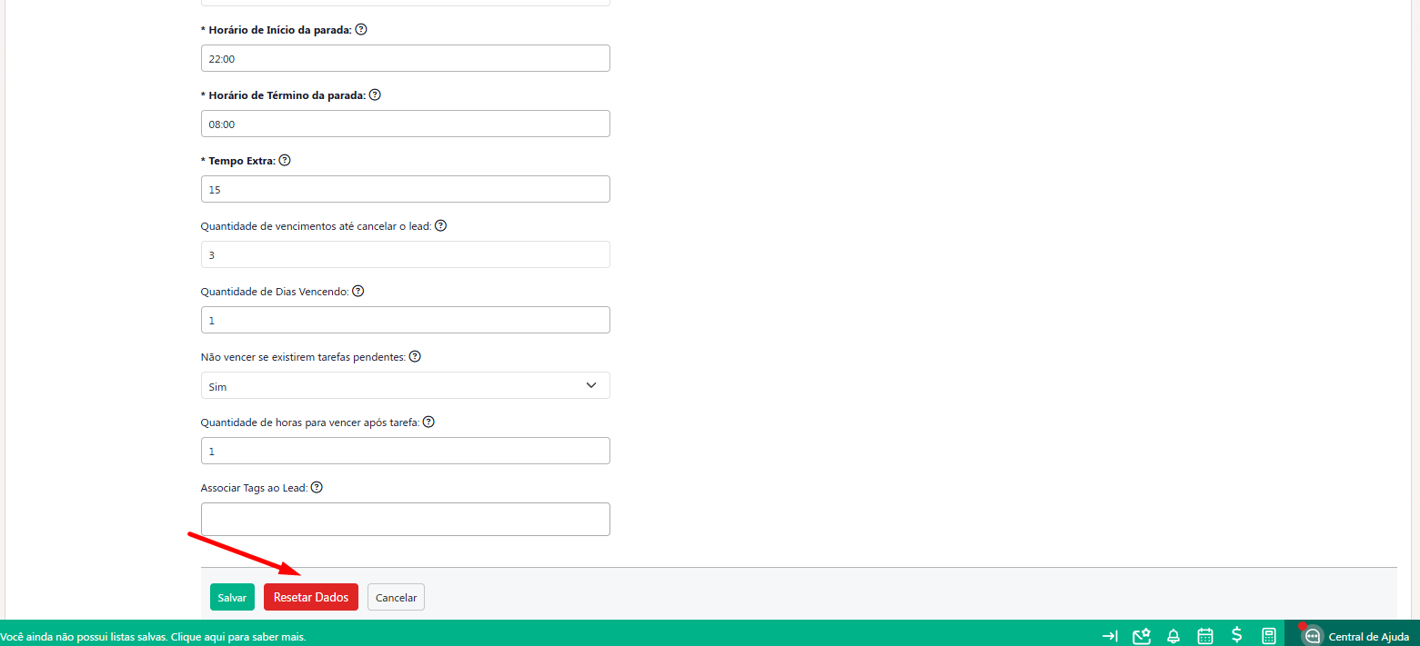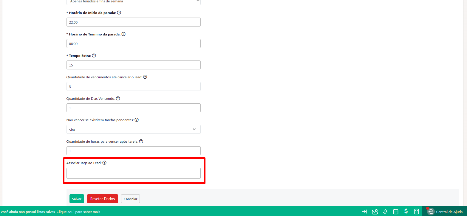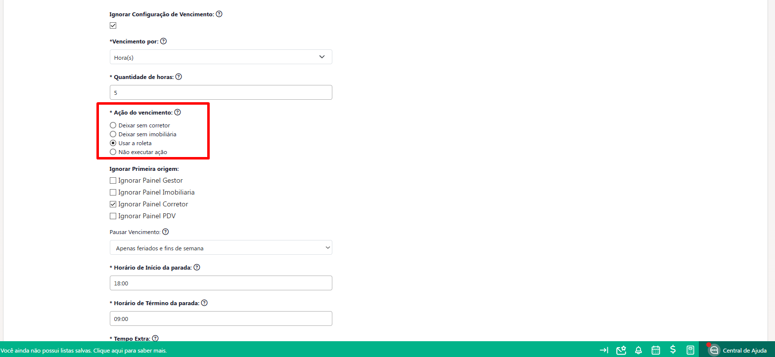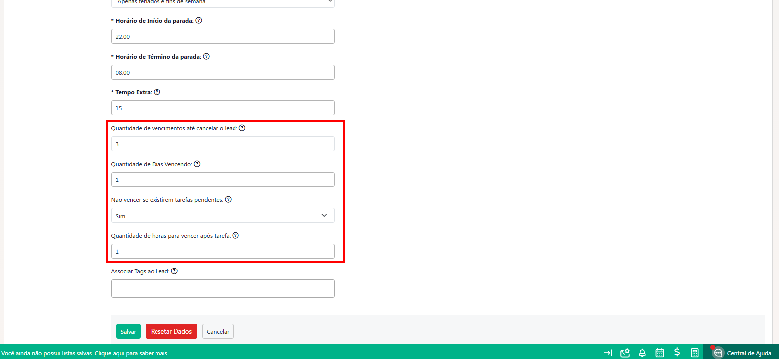 - Tempo extra: os leads que venceriam no "Horário de Término" podem receber um tempo extra, configurado nesse campo.