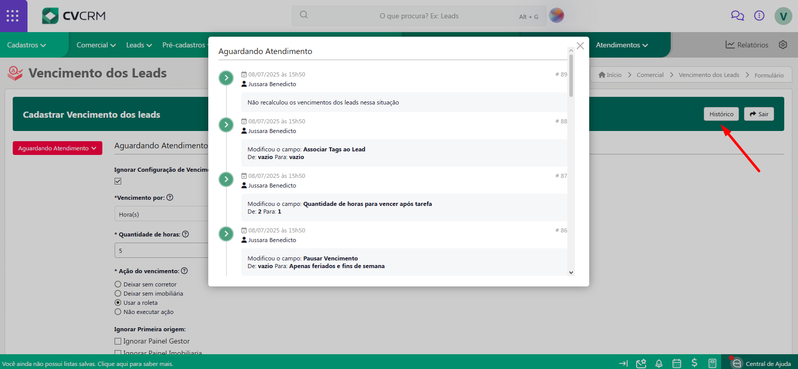 Além disso, para cada situação do Workflow de Leads, é possível visualizar o histórico.