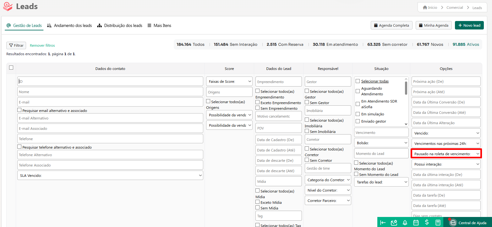 Agora é possível filtrar os leads pausados na roleta de vencimento tanto na listagem de leads quanto no relatório de leads. Estamos inserindo novos filtros para facilitar a localização e administração desses leads. Com isso, é possível, por meio de ações em lote, enviar esses leads manualmente para a fila, caso necessário.