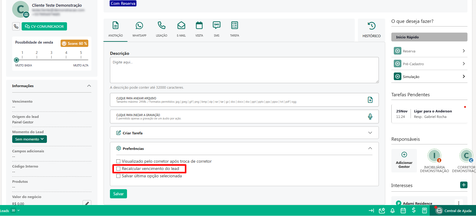 3ª Situação: quando é cadastrado alguma tarefa no lead, como um e-mail, WhatsApp ou visita. Para que o vencimento seja recalculado, é necessário marcar a opção “Recalcular vencimento do lead”: