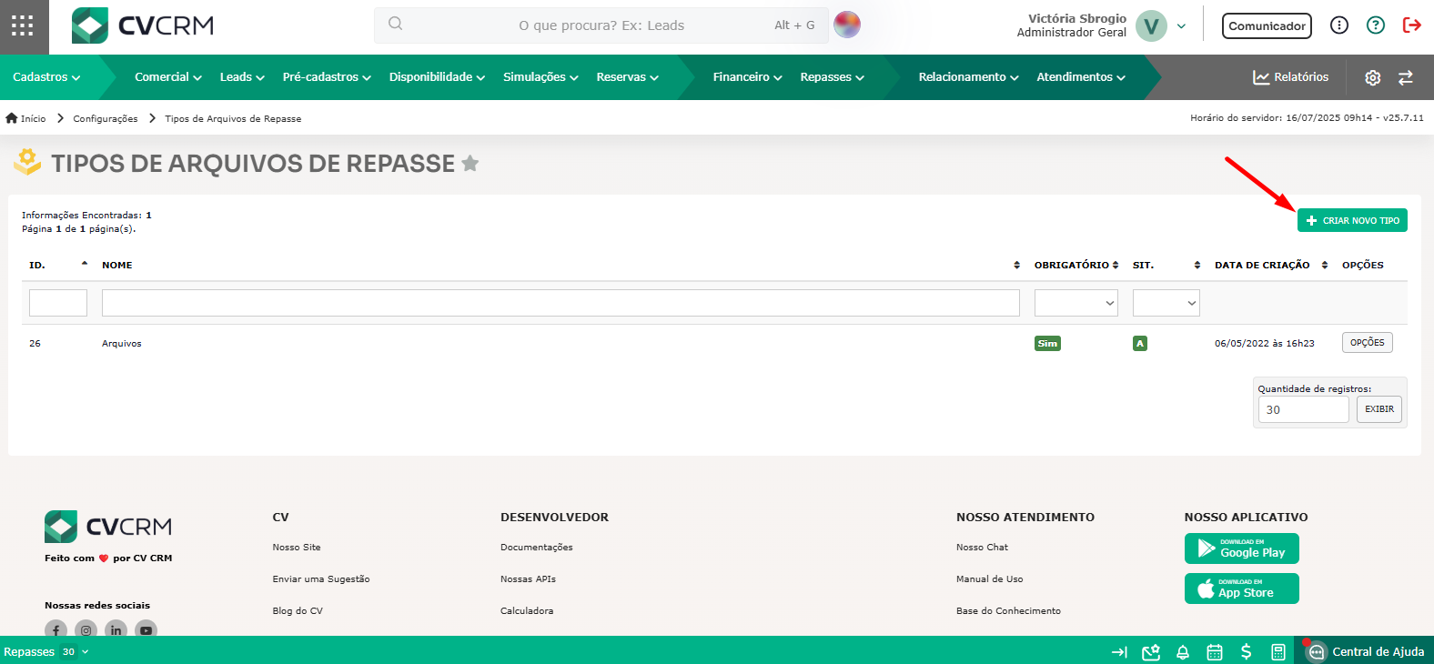 No administrar dos repasses, é possível adicionar documentos. Ao adicionar um documento, você precisa selecionar o “Tipo”. Para isso, você precisa cadastrar os tipos de arquivos de repasse no CV.