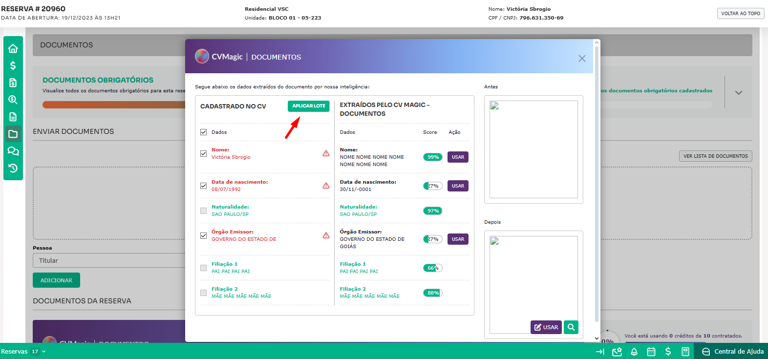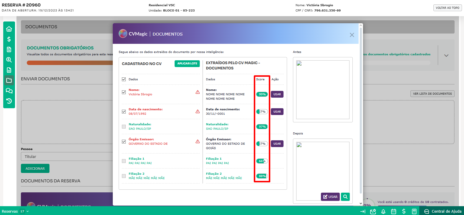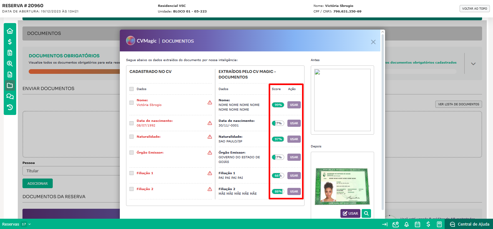 A ferramenta exibirá a imagem originalmente anexada (Antes) e a imagem editada (Depois), realizando ajustes de enquadramento. Assim, se o cliente enviou uma imagem invertida ou um pouco distante, o CV Magic | Documentos fará esses ajustes, permitindo que você visualize as versões Antes e Depois. Você pode optar por substituir a imagem original pela editada ao clicar no botão "Usar". Isso garante que, ao baixar os documentos, a versão atualizada da imagem seja incluída automaticamente. A imagem pode ser ampliada na tela ao clicar na lupa.