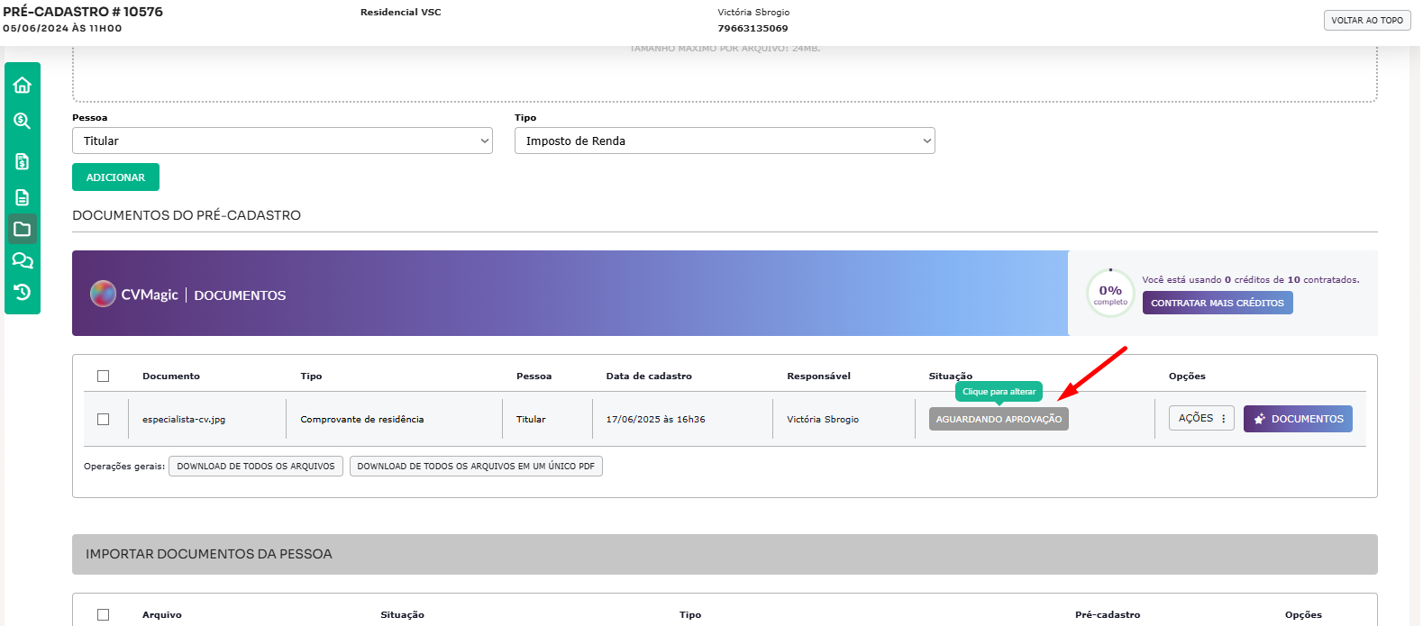 Após adicionar os documentos, eles irão aparecer na parte de baixo e você conseguirá saber se ele está aguardando aprovação ou se já foi aprovado. Os gestores, com permissão para aprovar, irão fazer a aprovação dos documentos.
