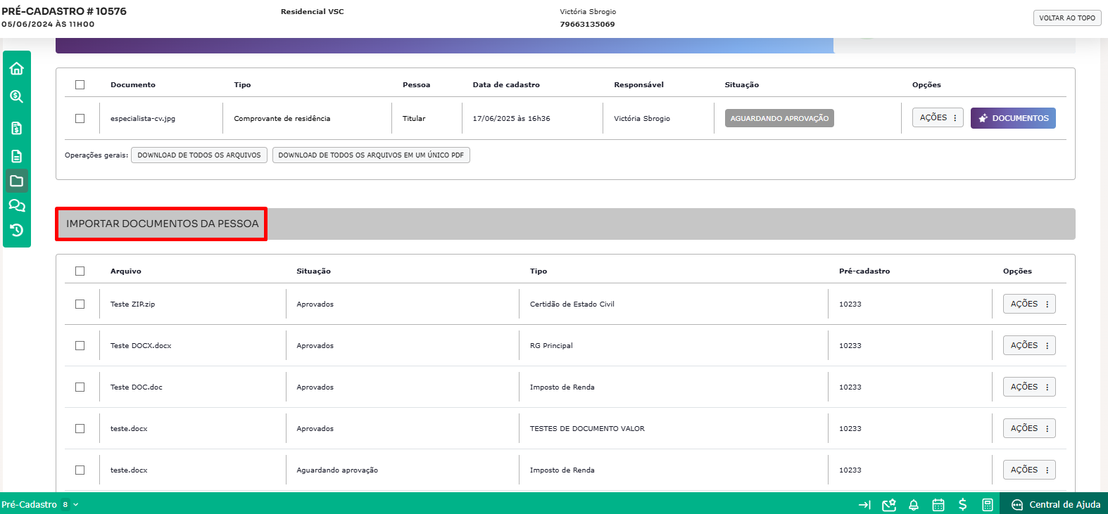 Se o cliente do pré-cadastro for pessoa e tiver outro pré-cadastro, é possível importar os documentos.