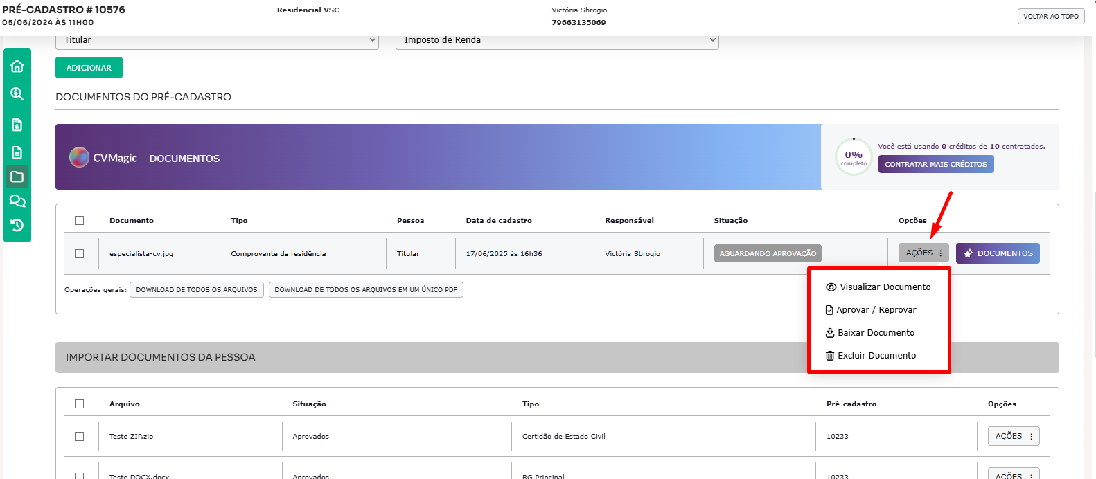 Dependendo da sua permissão, no botão de ações é possível visualizar o documento, aprovar/reprovar, baixar e excluir.