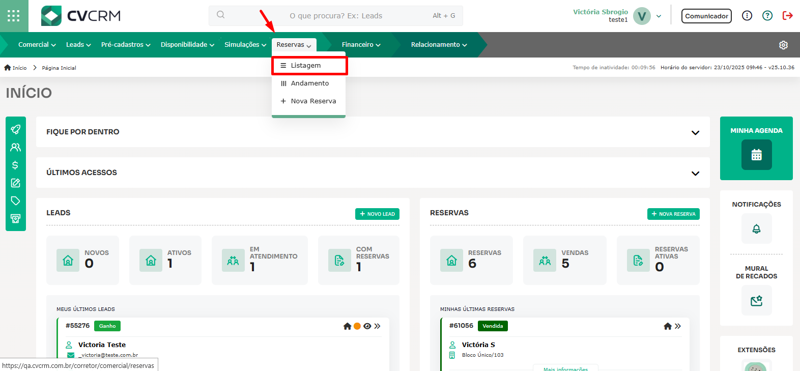 Ao acessar o Painel do Corretor, você terá à sua disposição um menu na parte superior. Procure pela seção de Reservas, localizada no menu principal. Ao posicionar o cursor do mouse sobre a opção "Reservas", você verá três opções disponíveis: Listagem, Andamento e Nova Reserva. Para prosseguir, clique em "Listagem".