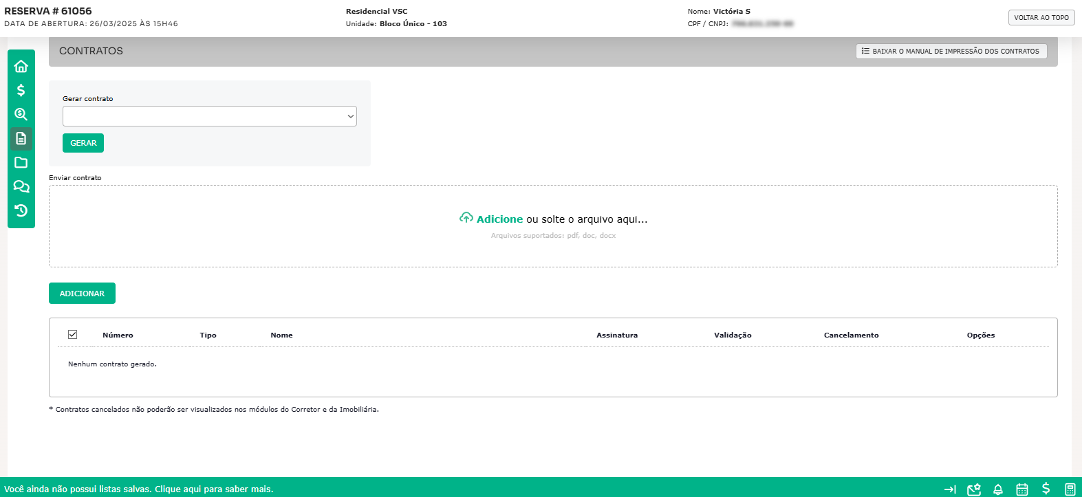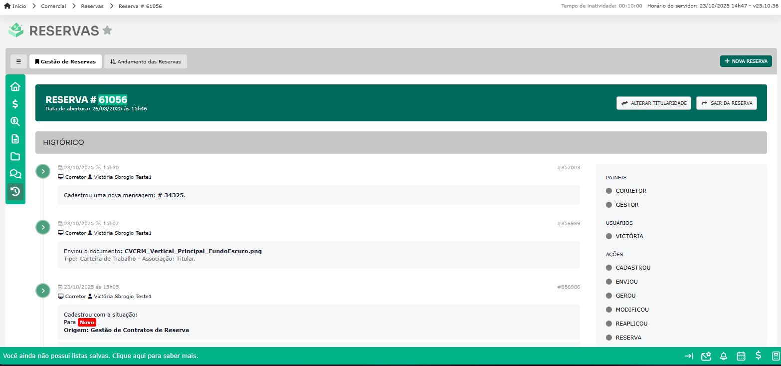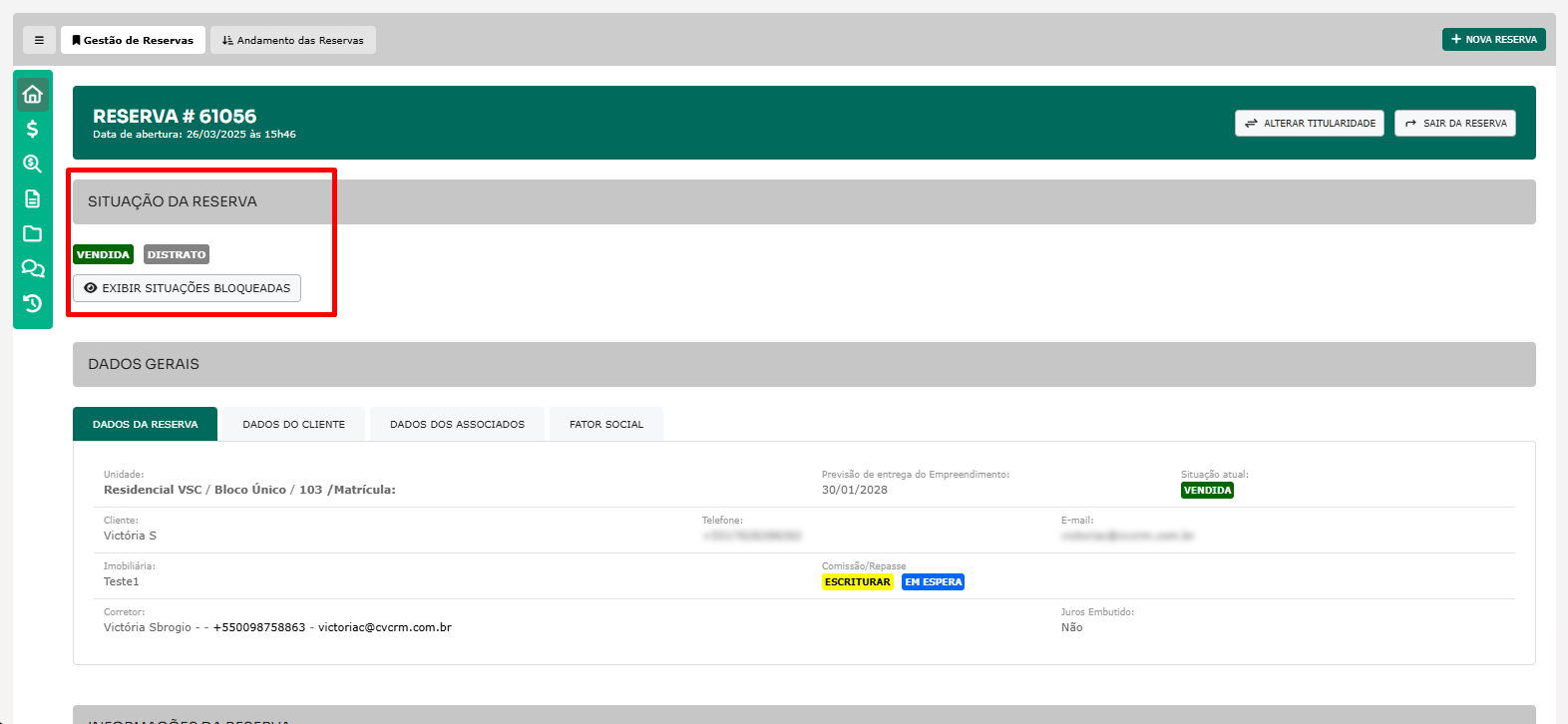 Após cadastrar uma reserva no CV CRM, como corretor, você terá a capacidade de administrá-la eficientemente. Isso significa que poderá gerenciar diversas informações, como os detalhes gerais, as questões financeiras e até mesmo acessar a análise de crédito. Além disso, você terá a possibilidade de gerar ou visualizar os contratos pertinentes, cadastrar mensagens relevantes e ter acesso ao histórico completo dessa reserva. Com essas funcionalidades, você terá total controle sobre o processo e poderá acompanhar todos os aspectos importantes da sua transação.