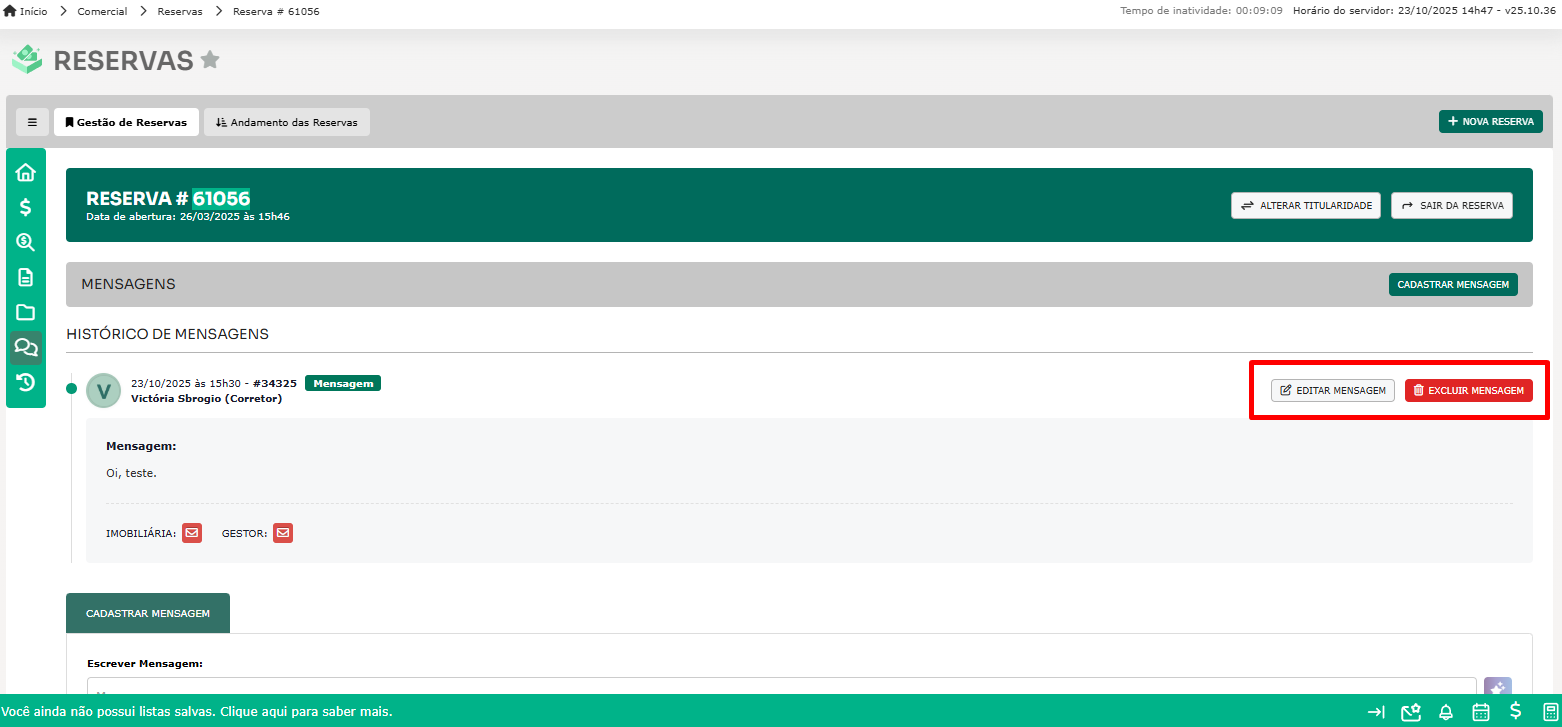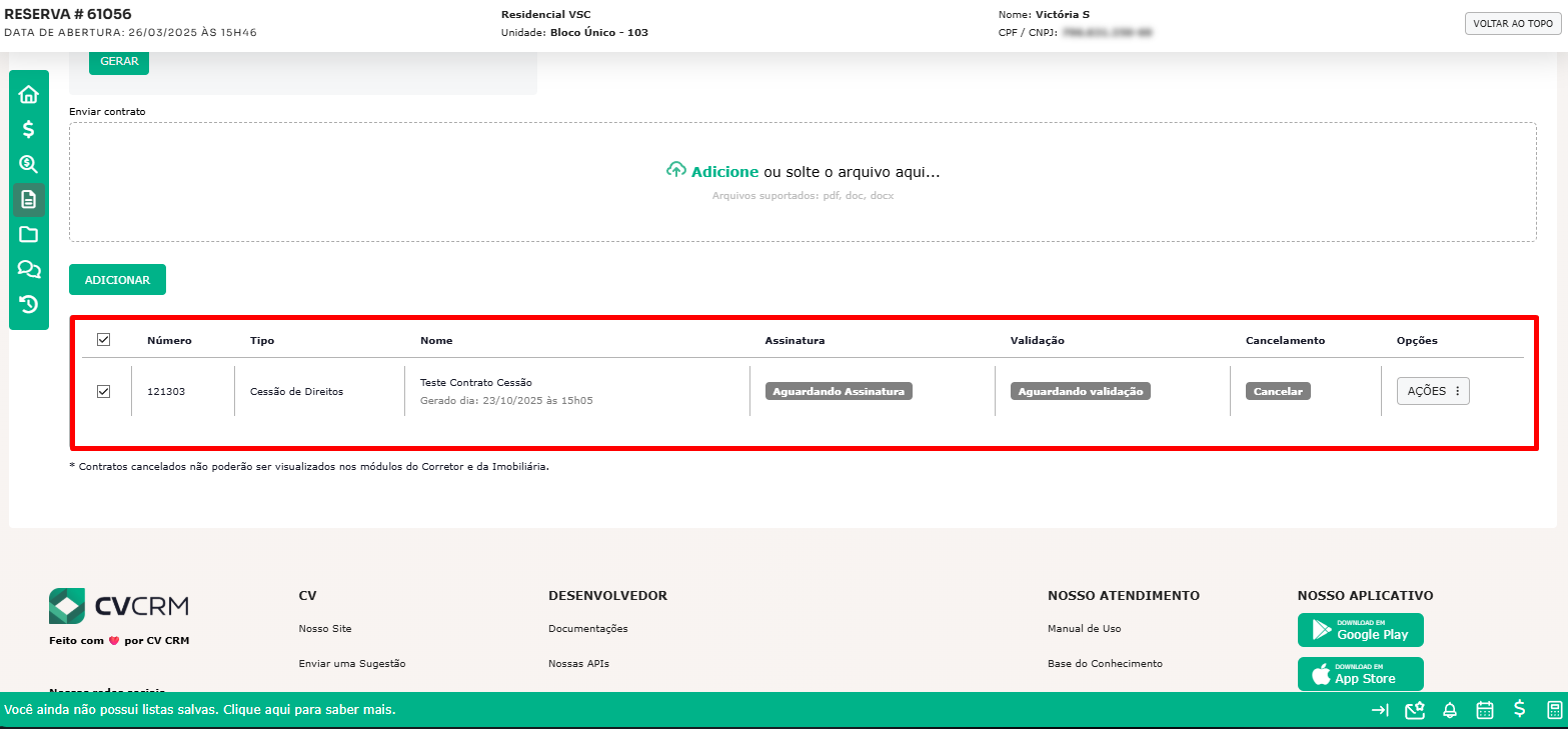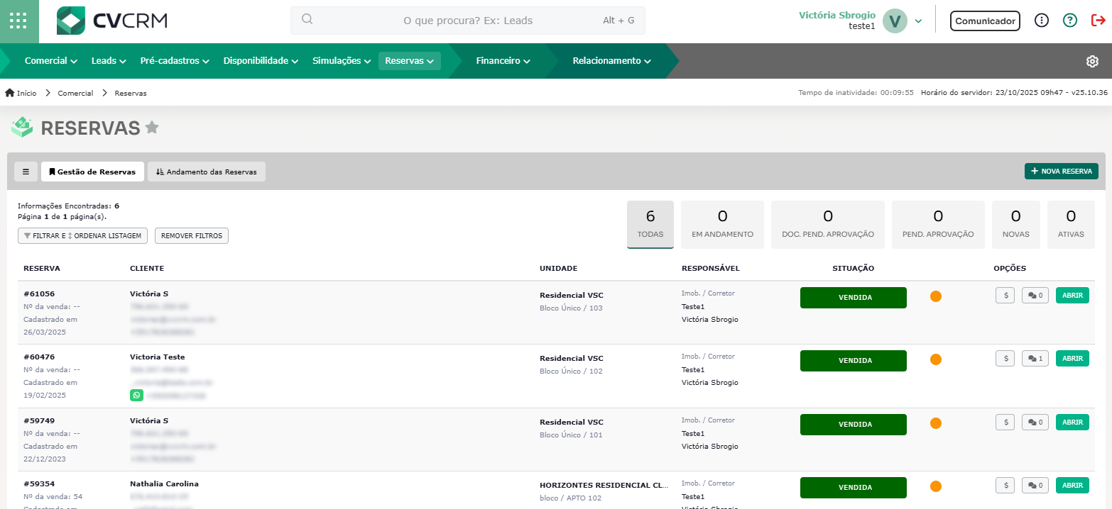 Após cadastrar uma reserva no CV CRM, como corretor, você terá a capacidade de administrá-la eficientemente. Isso significa que poderá gerenciar diversas informações, como os detalhes gerais, as questões financeiras e até mesmo acessar a análise de crédito. Além disso, você terá a possibilidade de gerar ou visualizar os contratos pertinentes, cadastrar mensagens relevantes e ter acesso ao histórico completo dessa reserva. Com essas funcionalidades, você terá total controle sobre o processo e poderá acompanhar todos os aspectos importantes da sua transação.