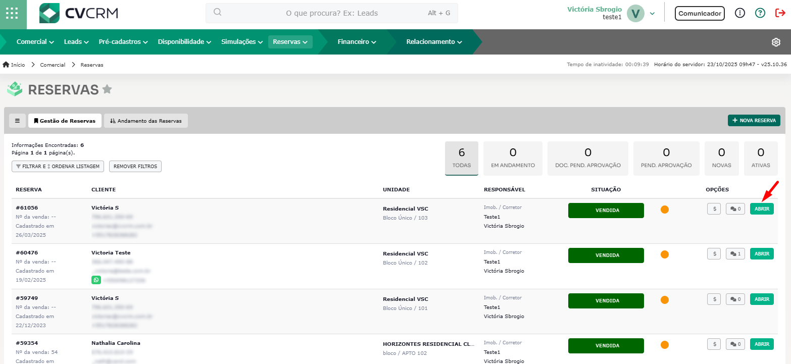 Na Listagem você irá visualizar as reservas feitas por você, ou seja, não é possível visualizar as reservas de outros corretores.