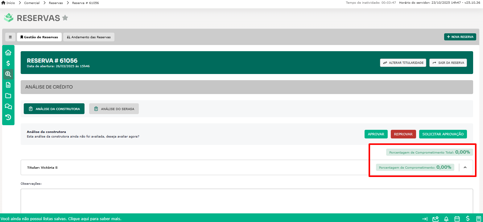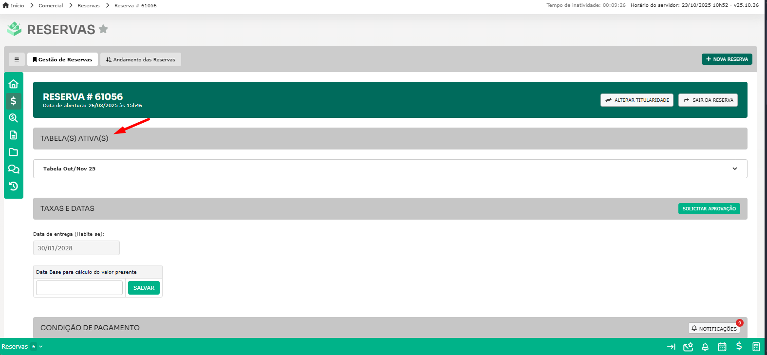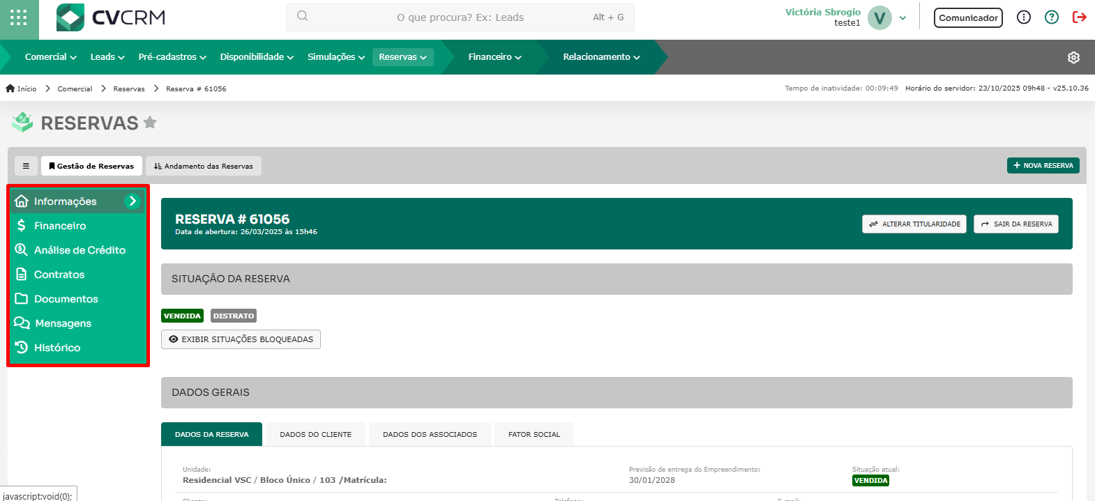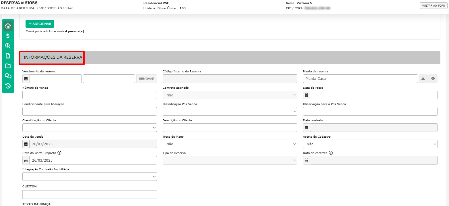 Na área “Informações da reserva” temos os seguintes vários campos e informações, como por exemplo, data de vencimento da reserva, número da venda, data contrato, entre outros.