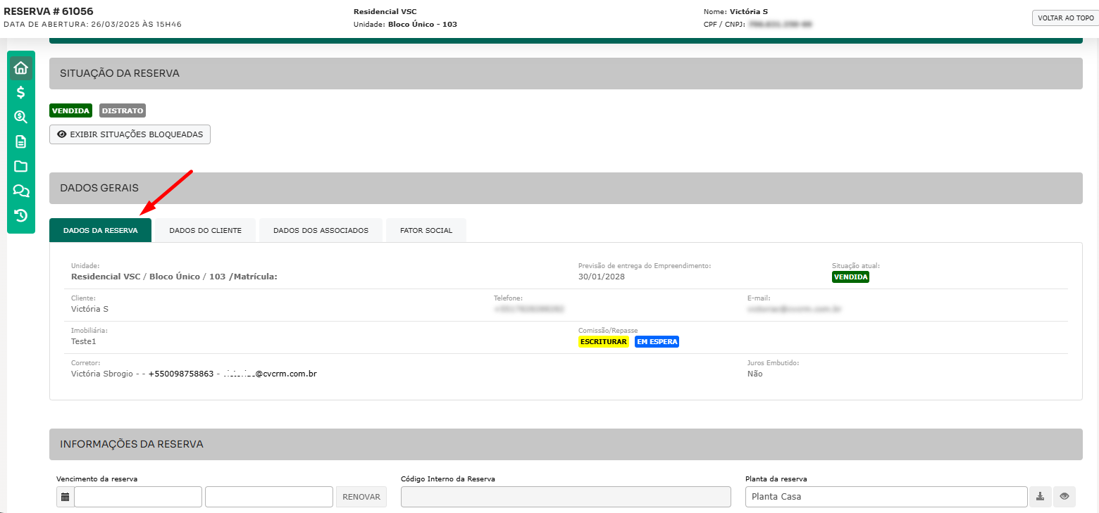Na aba "Dados da reserva", você consegue visualizar informações como empreendimento/unidade, previsão de entrega do empreendimento, situação atual, nome do cliente, telefone do cliente, e-mail do cliente, imobiliária e corretor responsáveis.