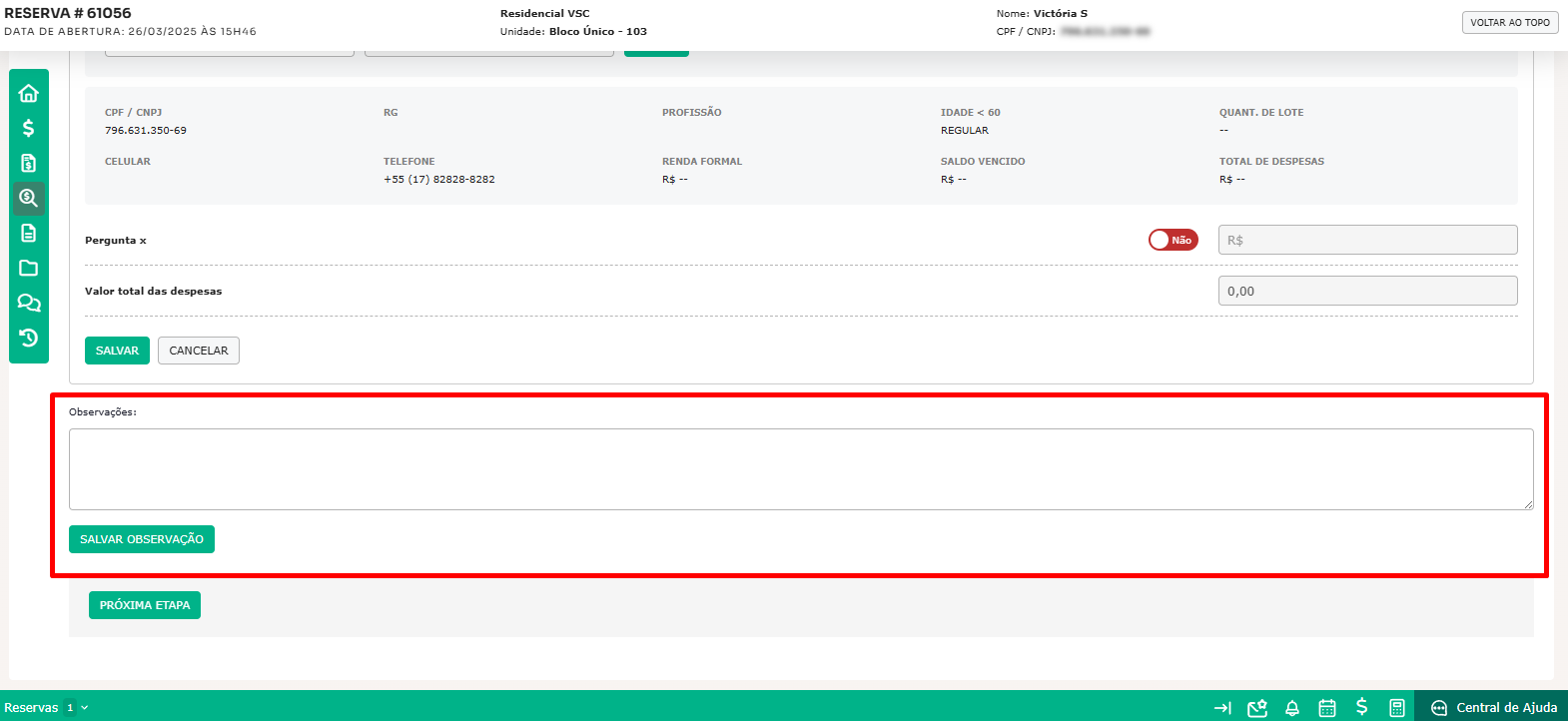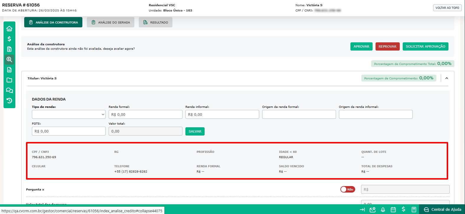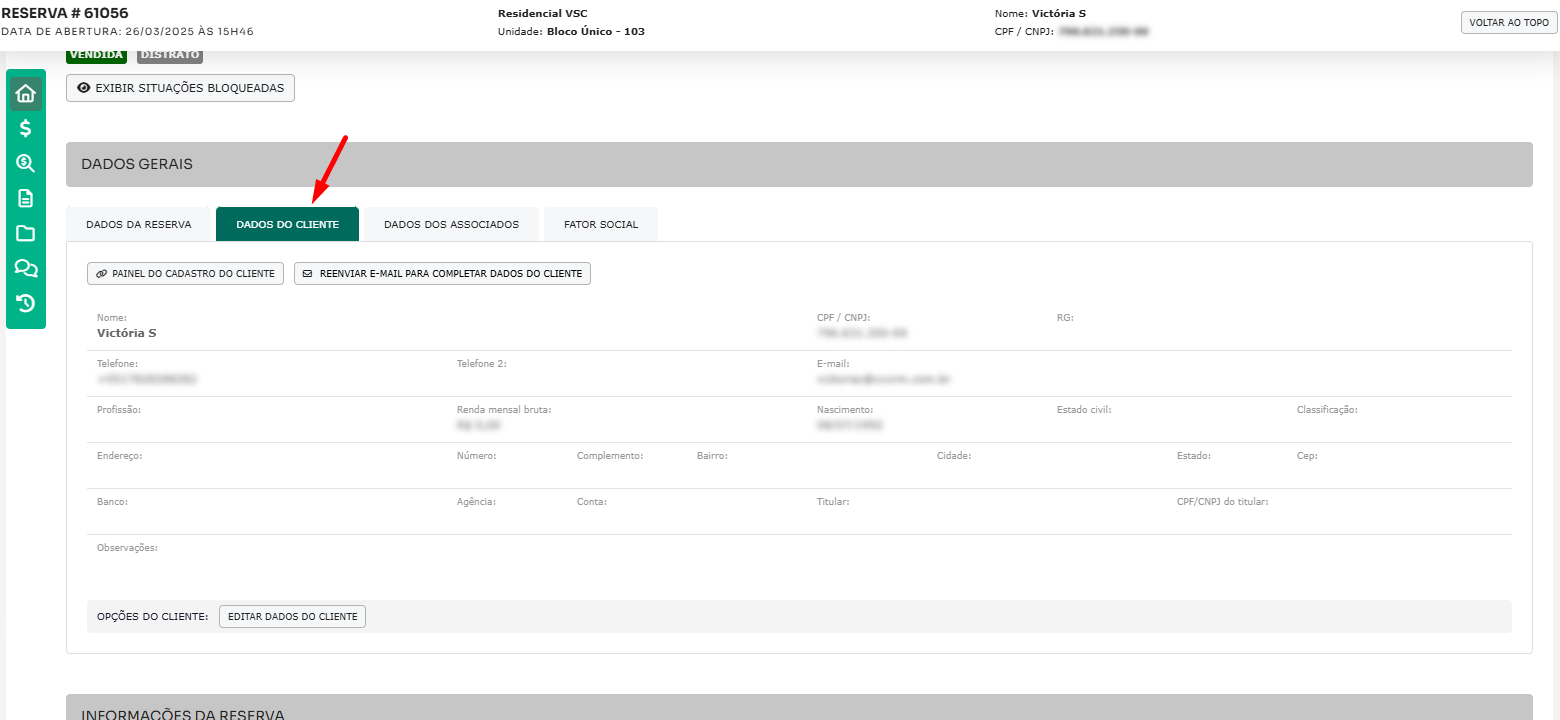 Além disso, você conseguirá visualizar os dados do titular da reserva, como: CPF/CNPJ, RG, profissão, idade < 60, quantidade de lote, celular, telefone, renda formal, saldo vencido e total de despesas. Lembrando que, se esses dados não foram preenchidos no cadastro do cliente, aqui estará em branco.
