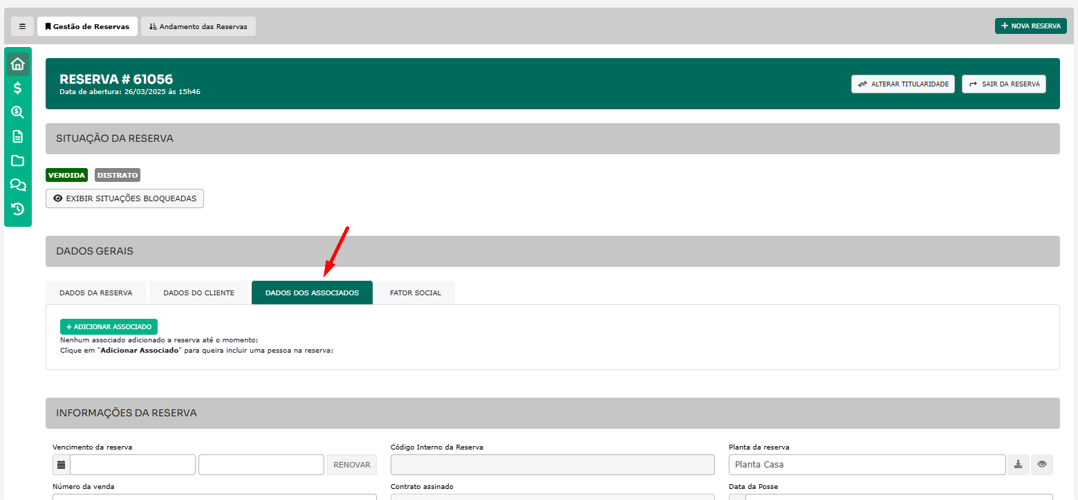 Se ao realizar o cadastro da reserva tenha sido adicionado um associado, será possível visualizar na aba “Dados dos associados”. Caso não, nessa área também é possível cadastrar um associado.