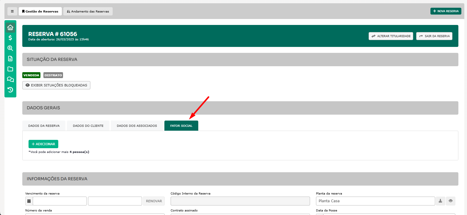 Por fim, na quarta aba, temos o "Fator Social". O Fator Social é uma funcionalidade que permite adicionar dependentes na reserva como critério social no processo de compra de imóveis, útil para programas de subsídio governamental. Este critério aumenta as chances de famílias brasileiras adquirirem a casa própria.