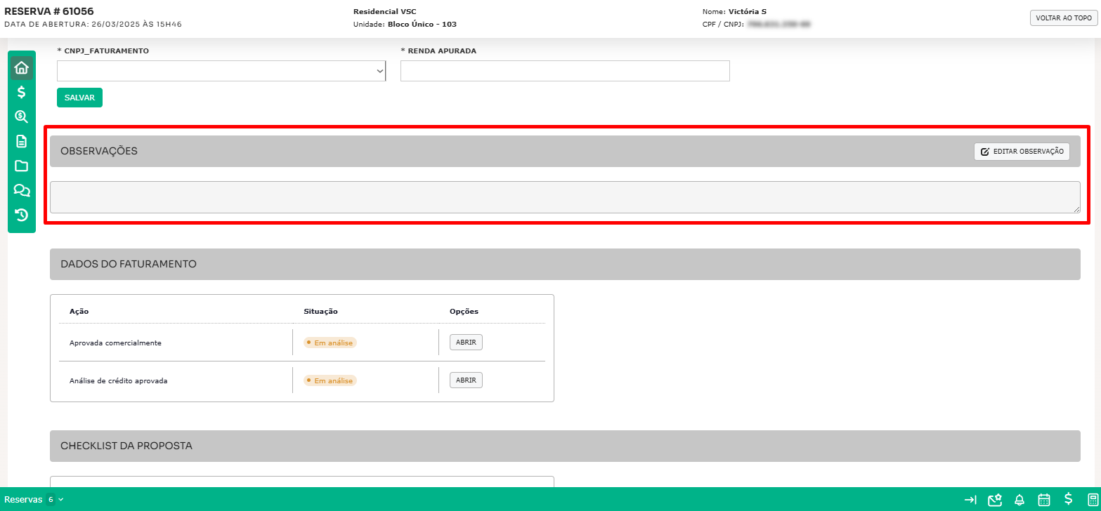 Temos, também, o campo de “Observações” para que você salve algo que ache relevante em relação a análise desse cliente na etapa da construtora.