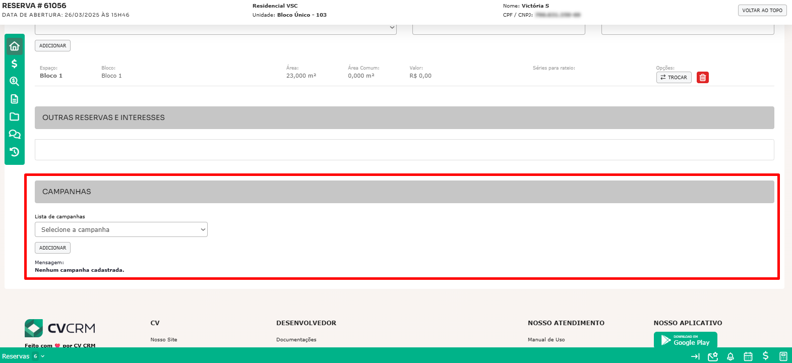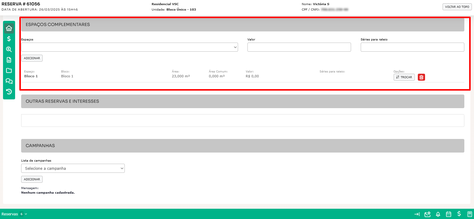 No CV, é possível cadastrar campanhas. Assim, caso o cliente da reserva faça parte de alguma campanha, é possível cadastrar nesta seção. Contudo, assim como Espaços Complementares, para associar uma campanha o gestor precisa liberar permissão no painel dele.