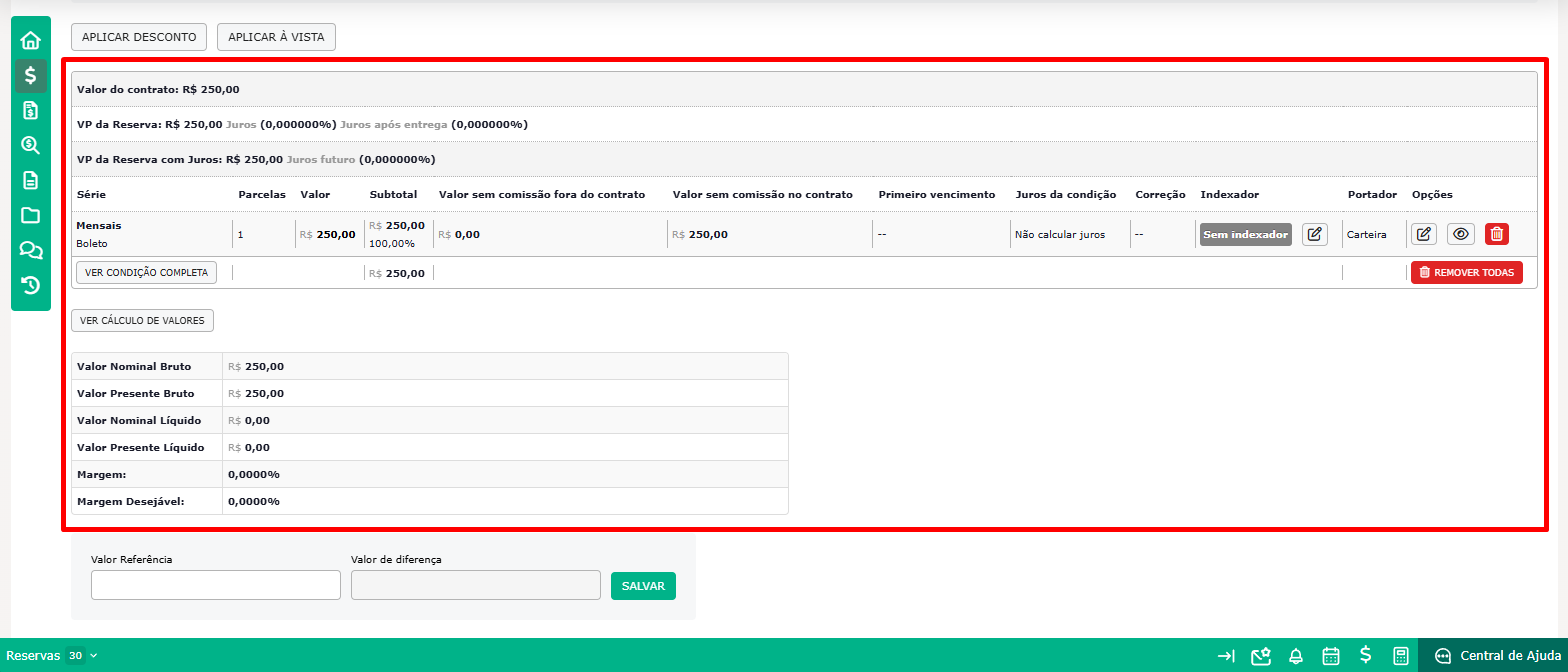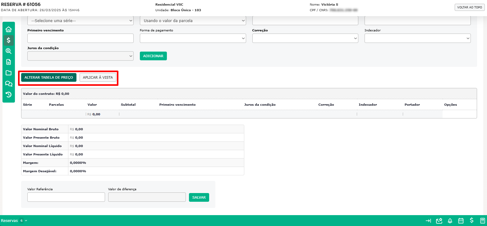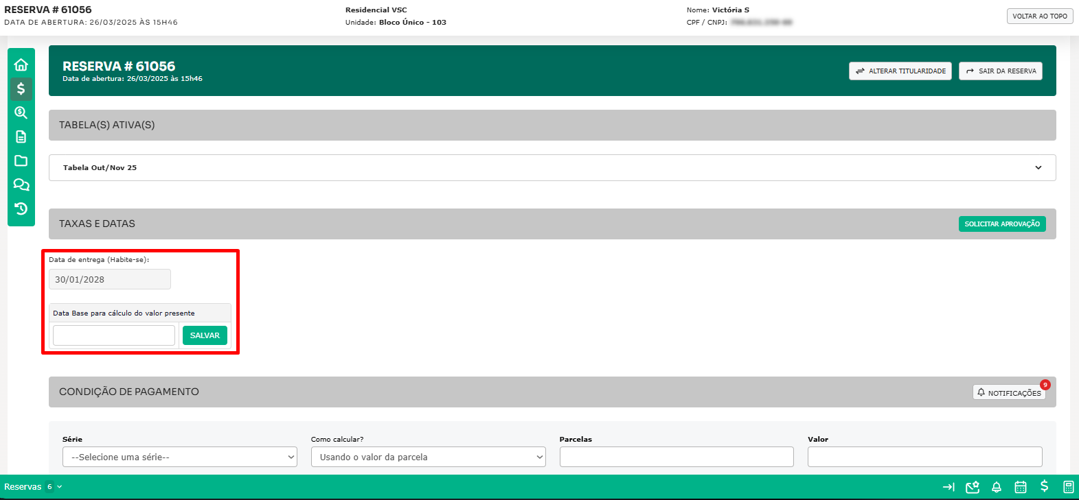 Obs.: a depender da configuração da incorporadora, não será possível visualizar e/ou editar a data base para o cálculo do valor presente.