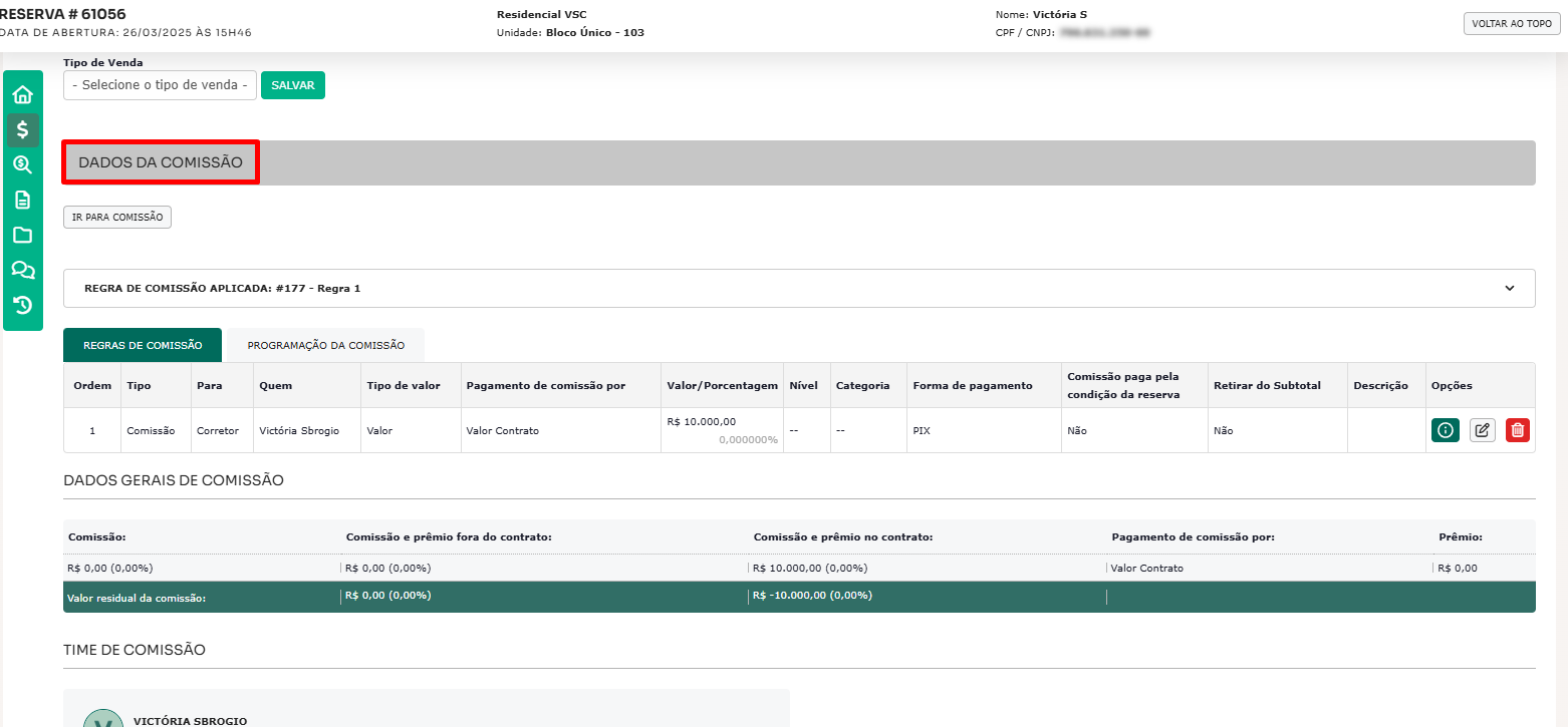 Em "Dados da comissão" é possível visualizar as regras de comissão, programação da comissão e programação da pagadoria (caso a incorporadora tenha a integração com pagadoria).