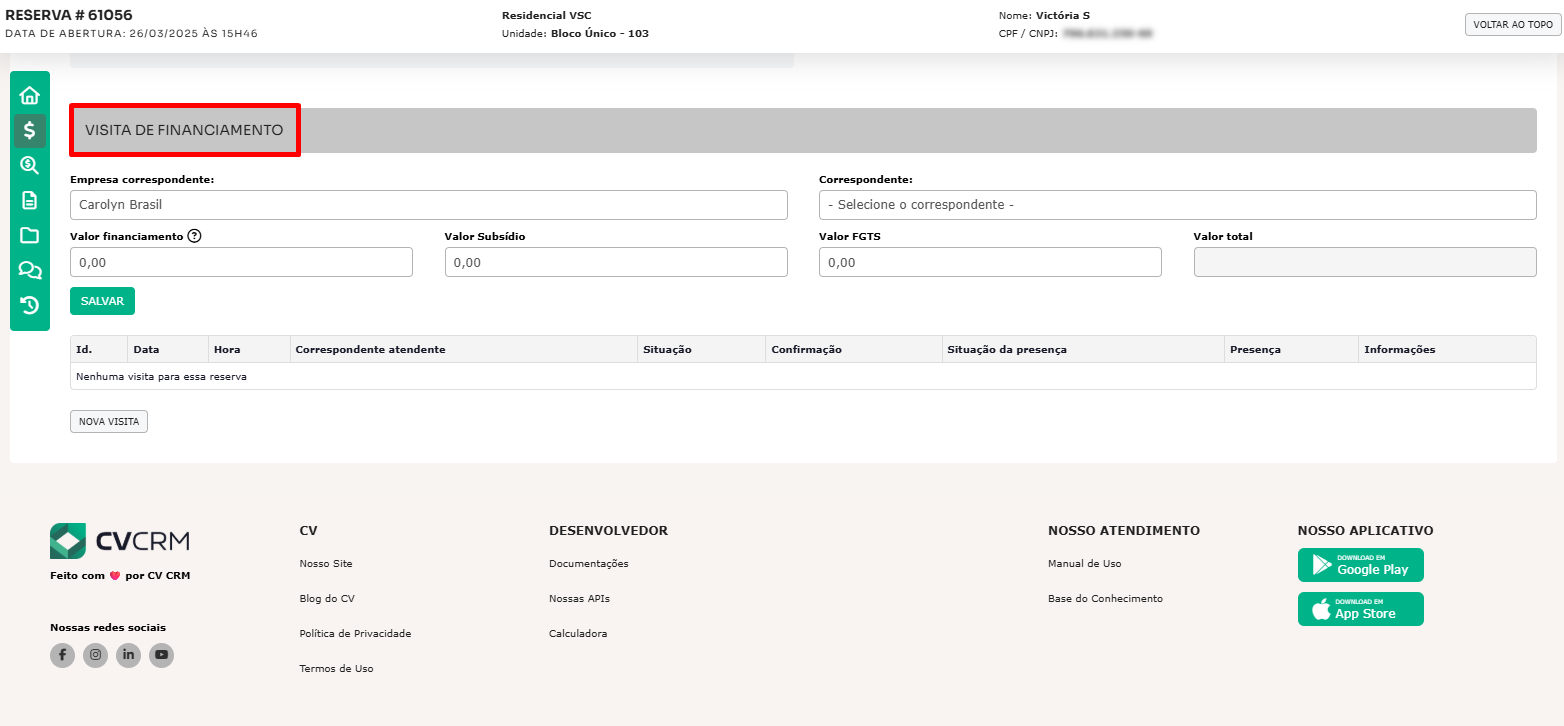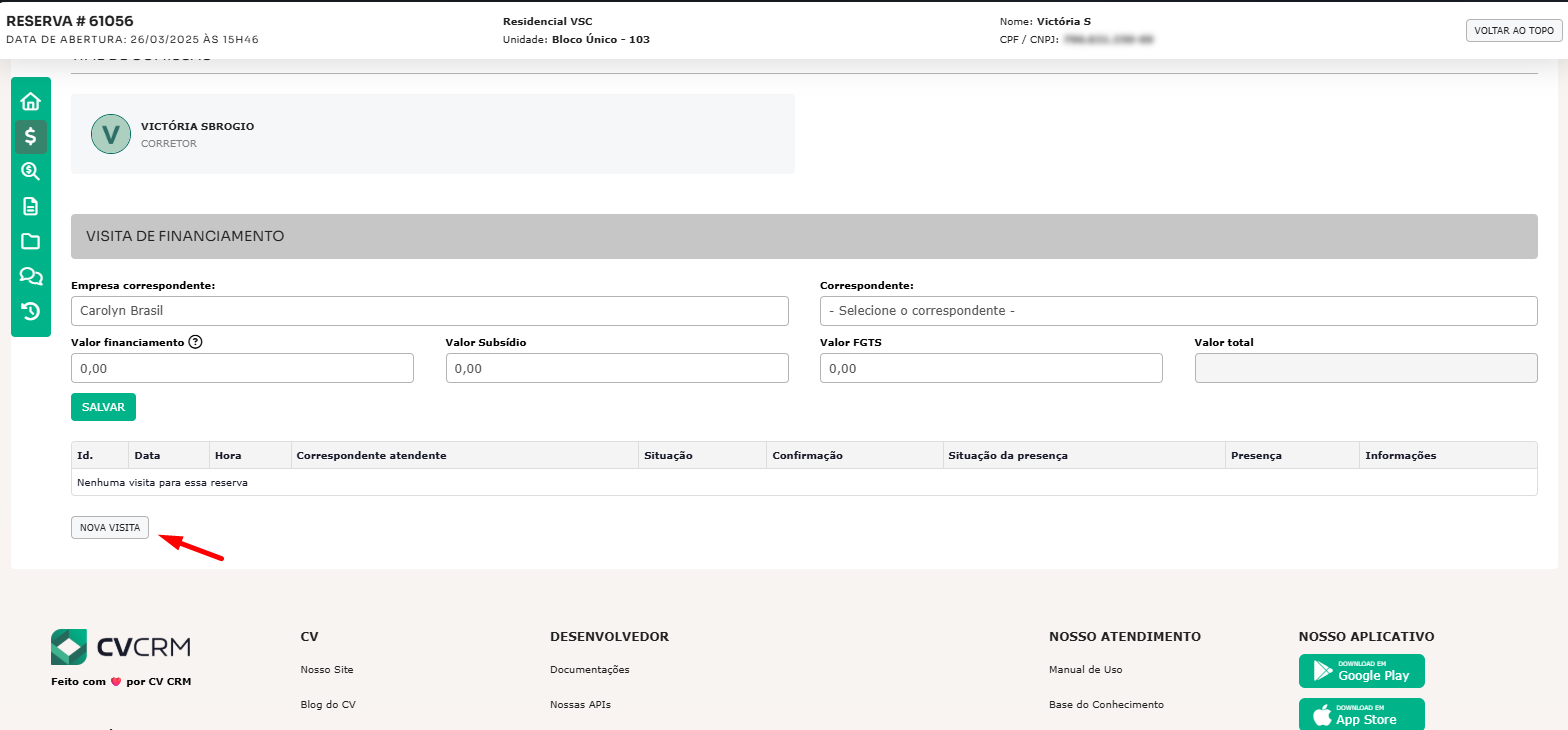 Para cadastrar uma visita de financiamento, clique em "Nova visita" e preencha as informações necessárias.