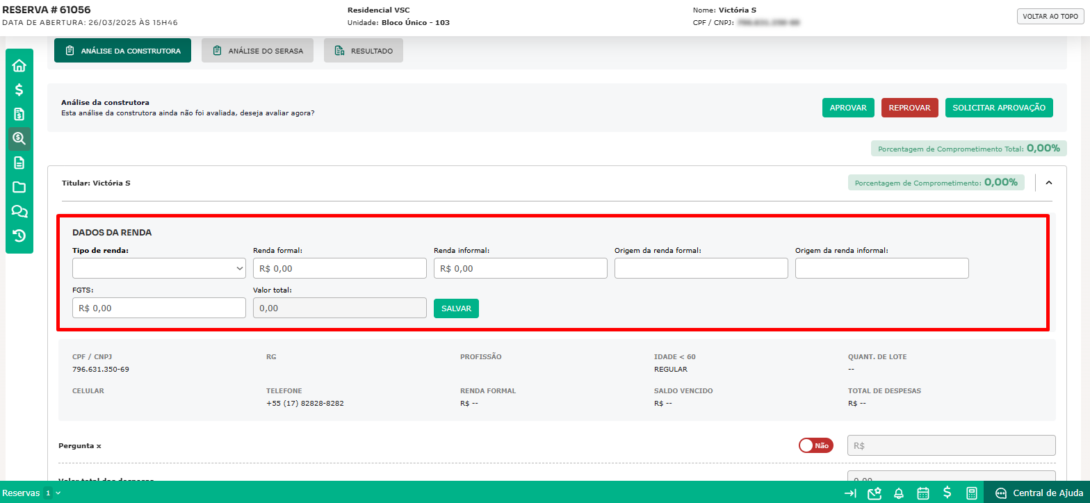 Ao clicar no titular, por exemplo, serão exibidos alguns campos para preenchimento como: tipo de renda, renda formal, renda informal, origem da renda formal, origem da renda informal, FGTS e valor total. De todos os campos, apenas o “Tipo de renda” é obrigatório. Contudo, para uma boa análise, é importante o preenchimento.