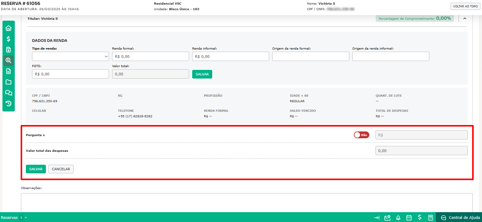 Abaixo dessas informações, pode haver algumas perguntas relacionadas as despesas desse cliente. Essas perguntas são cadastradas/personalizadas pela incorporadora através do Portal do Gestor, por isso pode ou não ter essas perguntas abaixo.