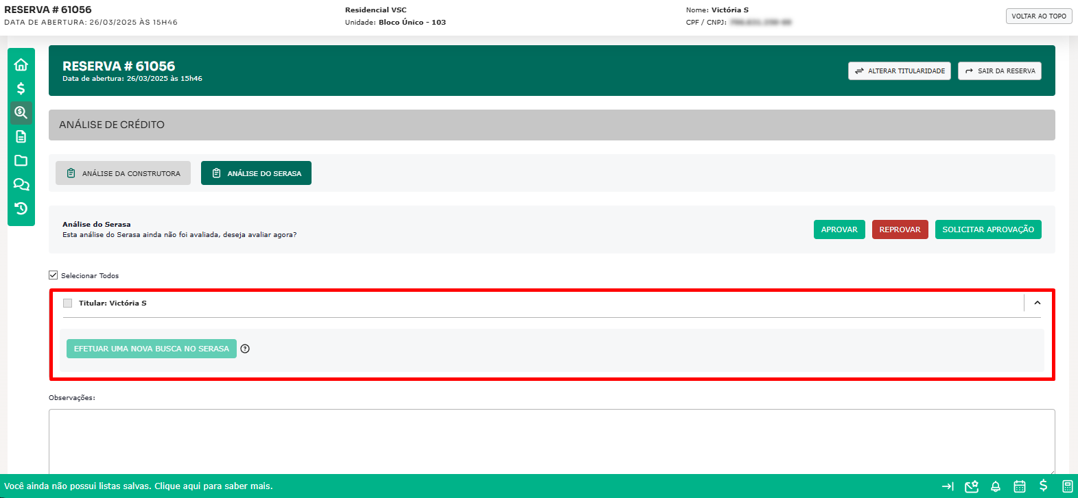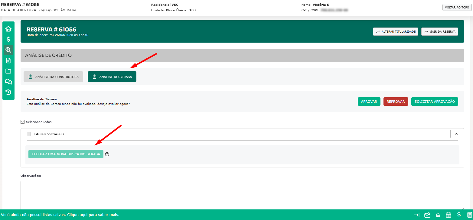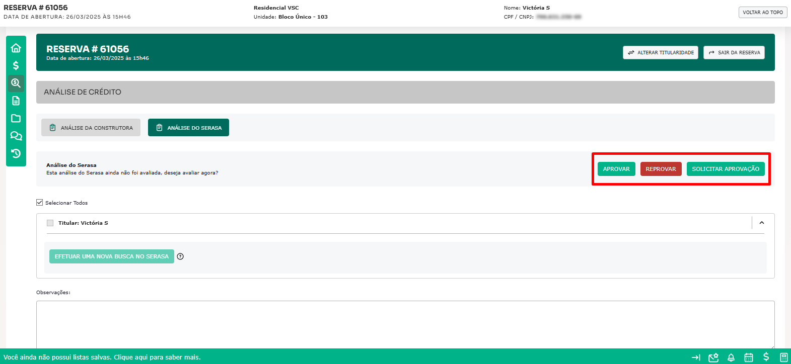 Obs.: para conseguir fazer essa análise, é necessário que a incorporadora tenha a integração com o Serasa Experian ativa no CV.