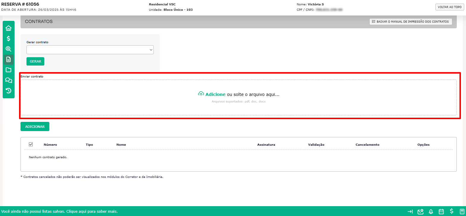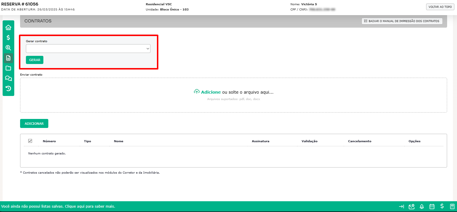 No menu "Contratos", é possível gerar e adicionar um contrato na reserva.