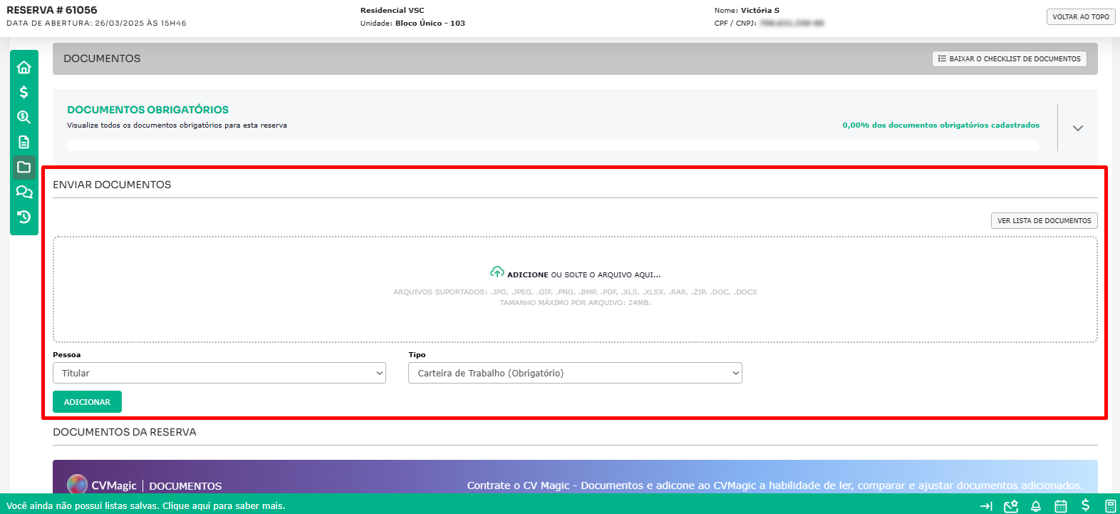 No menu “Documentos”, é possível adicionar documentos referentes à reserva. Para isso, selecione o tipo do documento (que é criado anteriormente pelo gestor), selecione a pessoa (se o arquivo é do titular da reserva, do associado, sócio etc.) e adicione o arquivo.