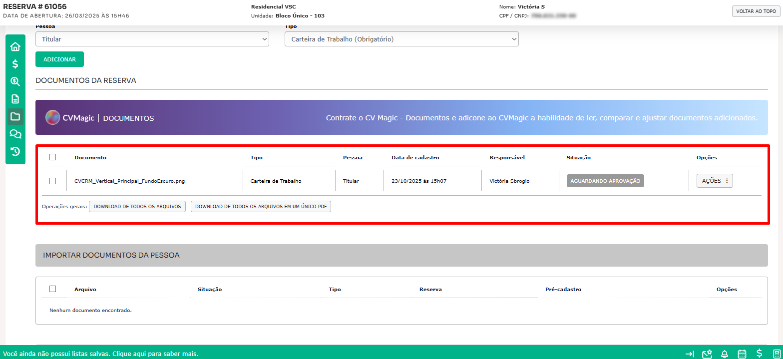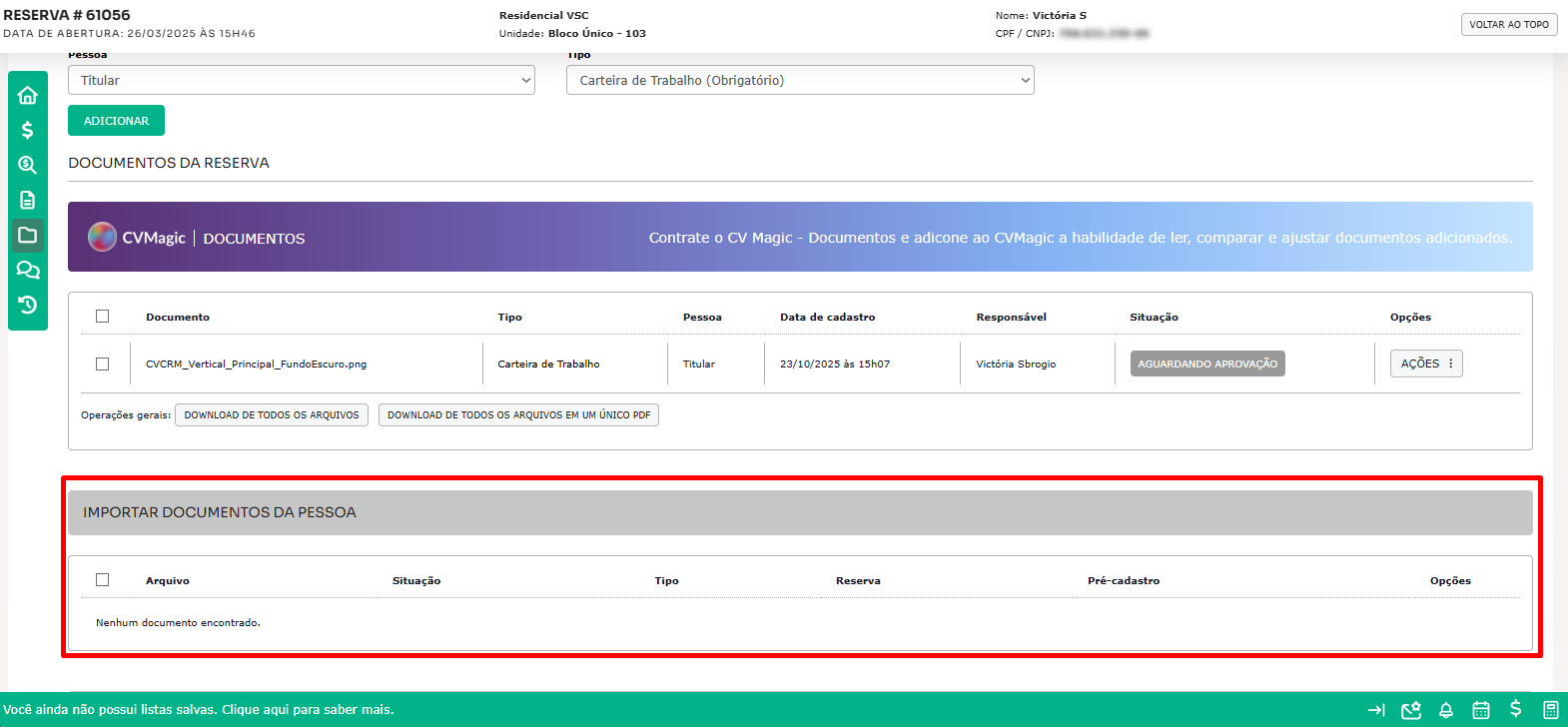 Se o cliente possuir outra reserva, em "Importar documentos da pessoa" você conseguirá visualizar o nome do arquivo, a situação (aguardando aprovação, aprovado ou reprovado) o ID da reserva no qual esses arquivos estão e os botões para visualizar e fazer o download.