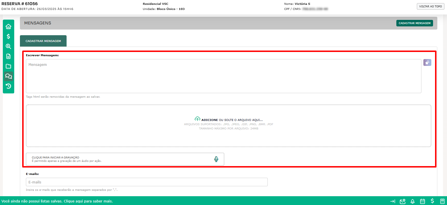 Abaixo da área para adicionar a mensagem em texto e anexar arquivos, temos o campo “E-mails”. Nessa parte, você poderá adicionar e-mails externos, como por exemplo, do cliente e associados. Para adicionar mais de um e-mail, é necessário separá-los por vírgula (,).