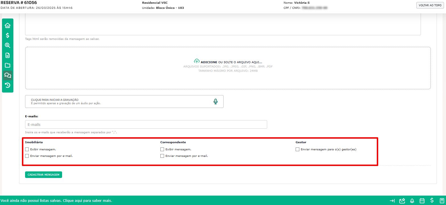 Abaixo do campo “E-mails” temos as opções: Imobiliária, Correspondente e Gestor. Assim, caso você deseje que a imobiliária visualize a mensagem que você vai cadastrar na reserva, é necessário selecionar o campo “Exibir mensagem para a imobiliária”. E para enviar a mensagem através do e-mail cadastrado na imobiliária, é necessário marcar o campo “Enviar mensagem para a imobiliária”. Isso vale para o correspondente e para o gestor, com a ressalve que qualquer mensagem cadastrada por você o gestor conseguirá visualizar no portal dele. Assim, para o gestor você consegue definir, apenas, se é para enviar ou não para o e-mail dele.
