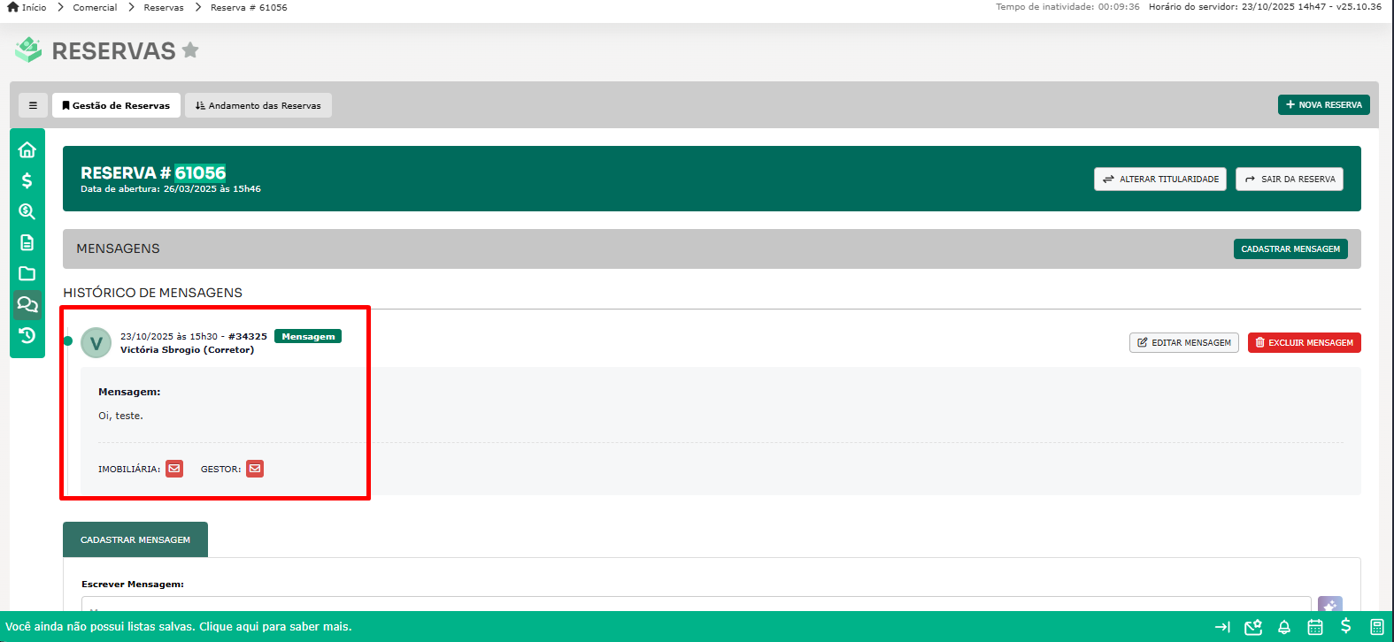 As mensagens cadastradas ficam registradas no início da tela do menu “Mensagens”. Assim, no histórico das mensagens, é possível visualizar o dia/hora, quem registrou a mensagem e a mensagem cadastrada. Além disso, é possível saber se a mensagem foi enviada por e-mail para a imobiliária/correspondente/gestor.