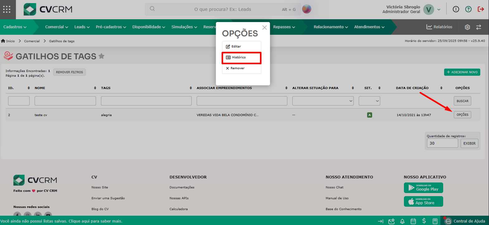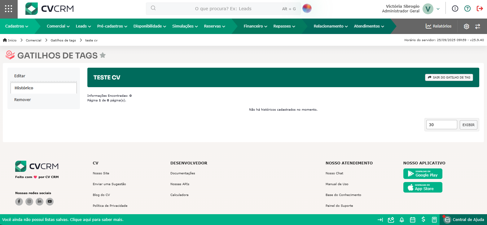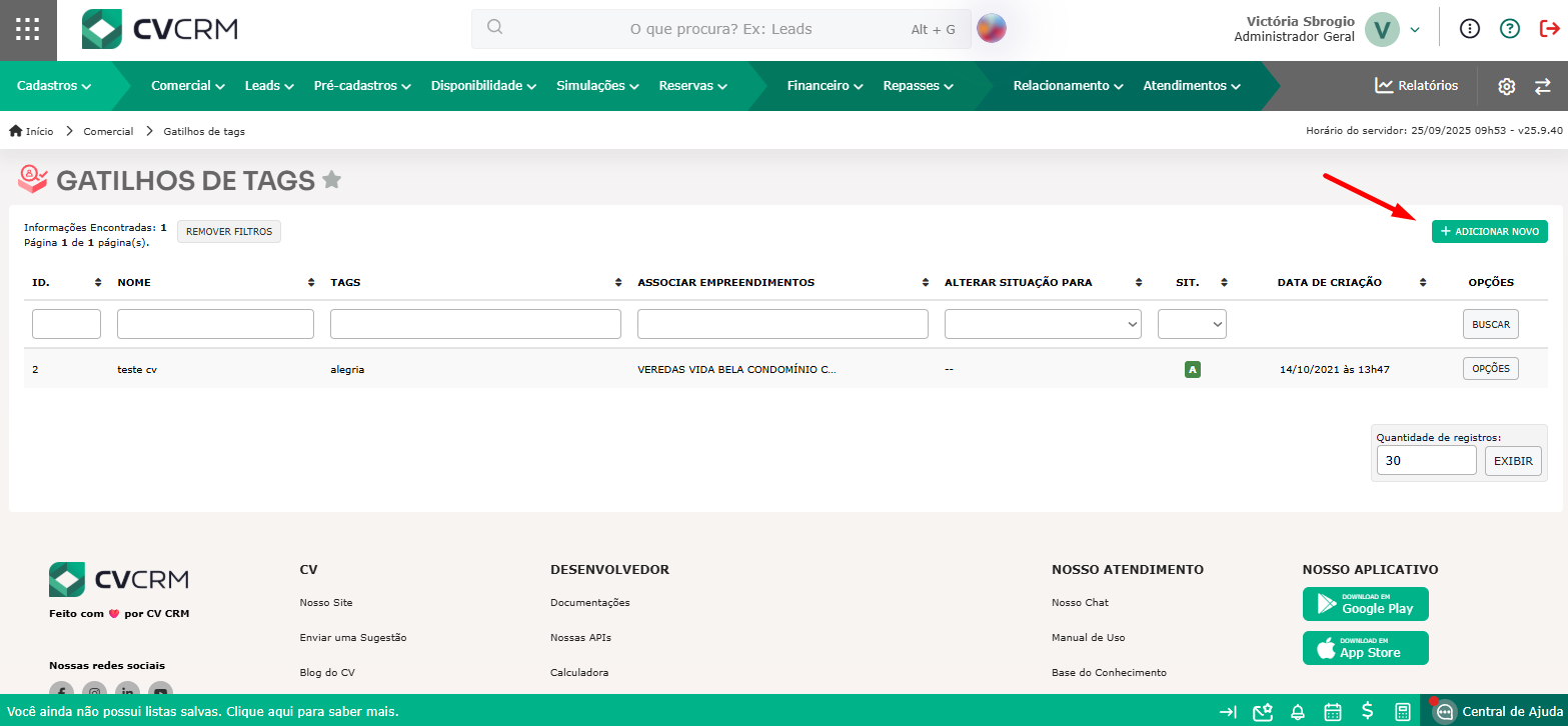 No CV, os gatilhos de tags automatizam ações quando um lead entra no sistema via API ou importação.