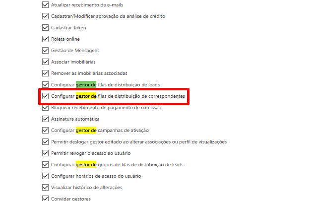 Para configurar a Filas de Distribuição de Correspondente, você precisa ter as seguintes permissões liberadas no perfil de acesso (aba "Comercial"):