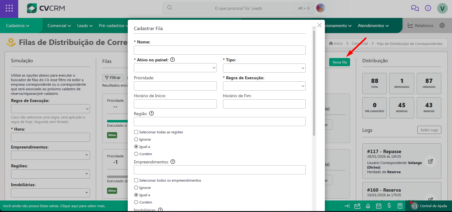 Em seguida, clique em "Nova Fila".