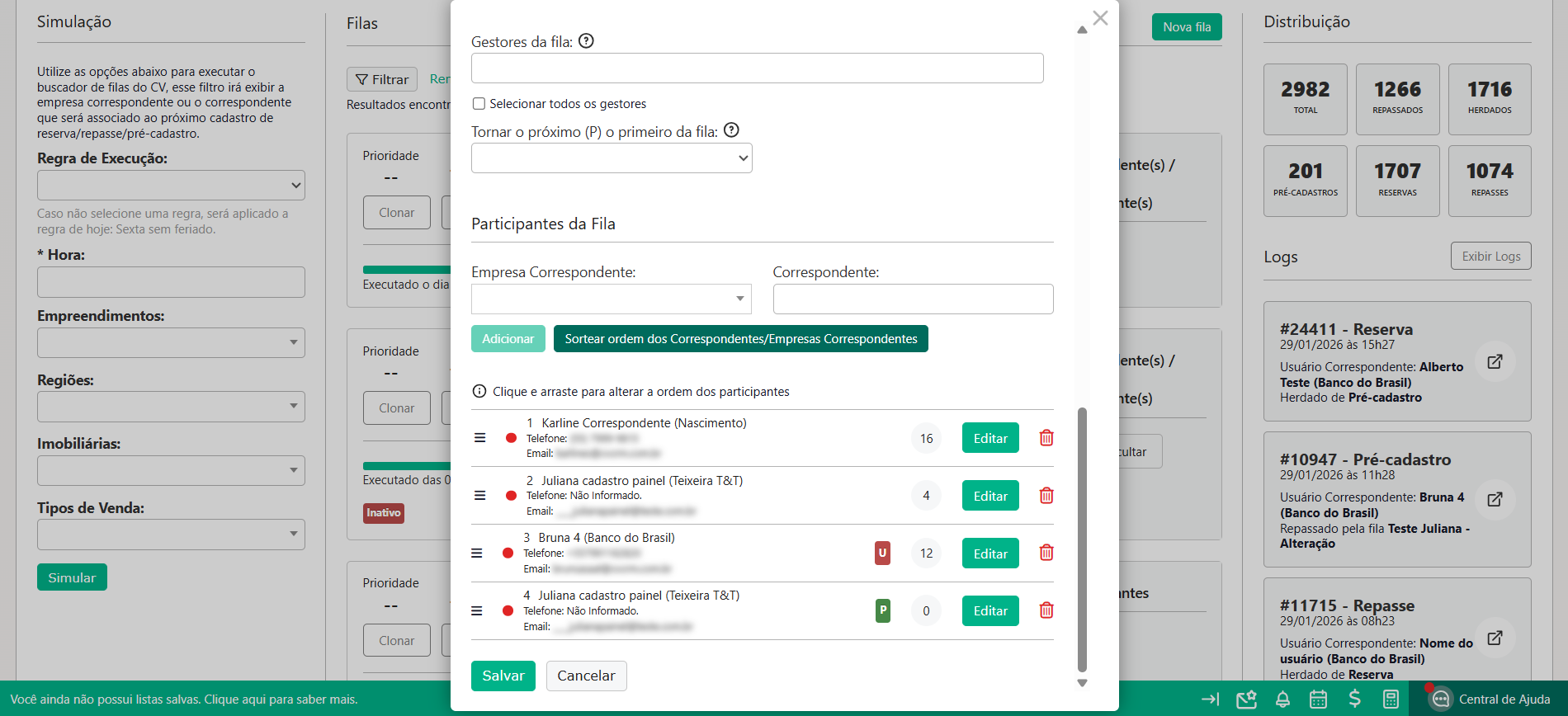 A Fila de Distribuição de Correspondentes tem como objetivo garantir que os pré-cadastros, reservas e repasses sejam automaticamente direcionados aos correspondentes bancários de acordo com critérios predefinidos. A funcionalidade foi criada para que, ao receber uma nova solicitação que se encaixe nas condições da fila, o sistema distribua as tarefas automaticamente, sem que seja necessária intervenção manual.