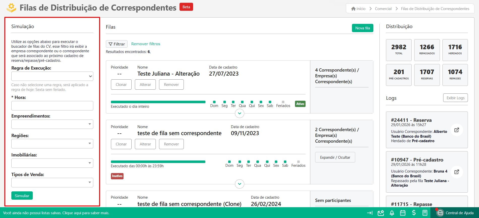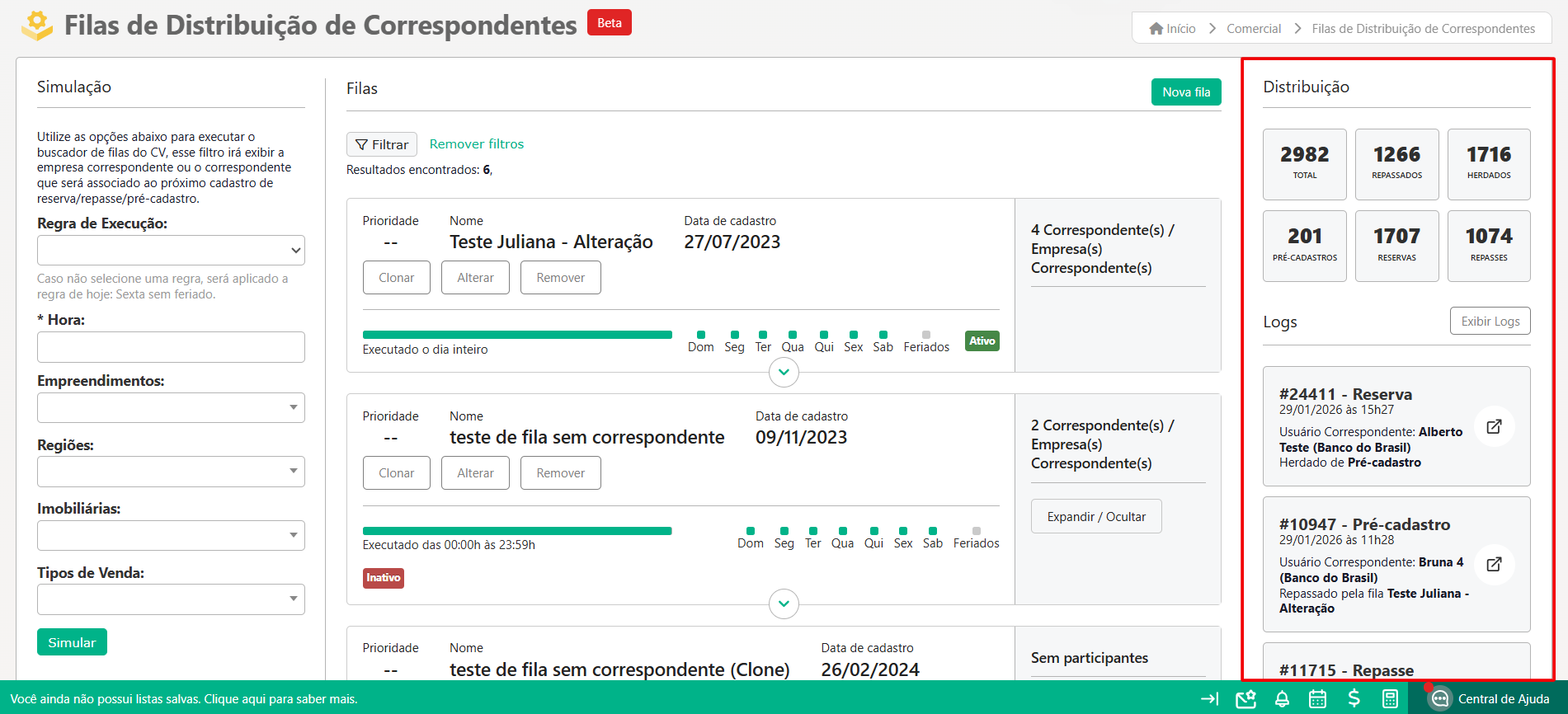 - Automação e Organização: Atribuição automática e ordenada de pré-cadastros, reservas e repasses aos correspondentes, seguindo critérios definidos na fila, como região, empreendimento e prioridade.