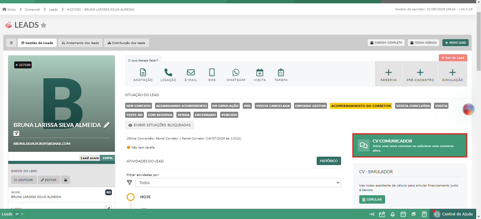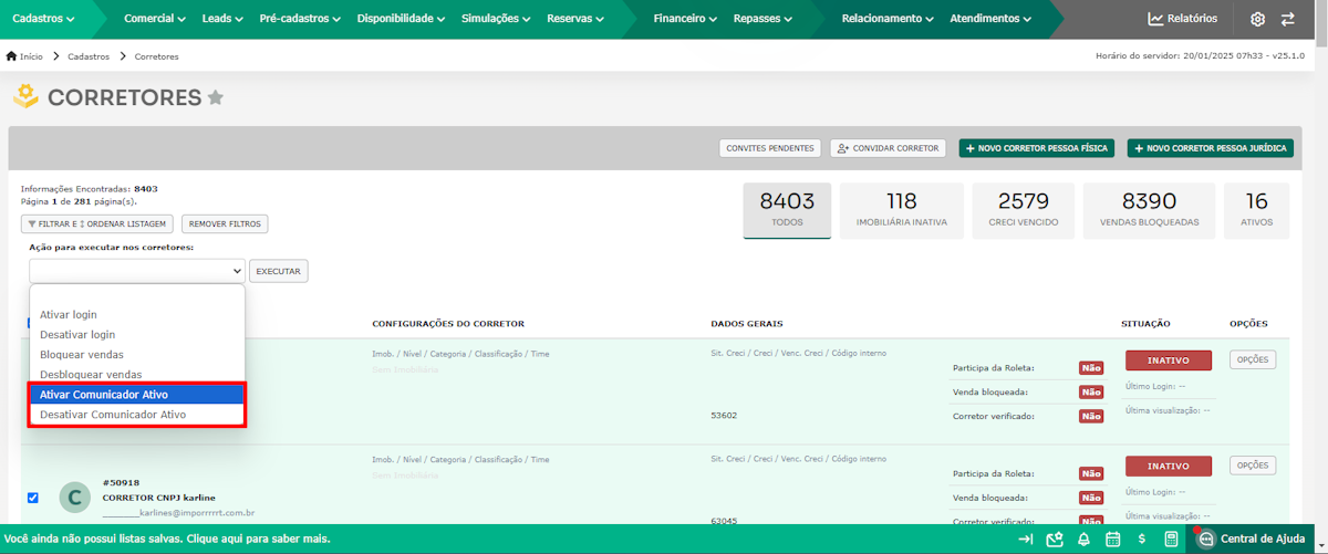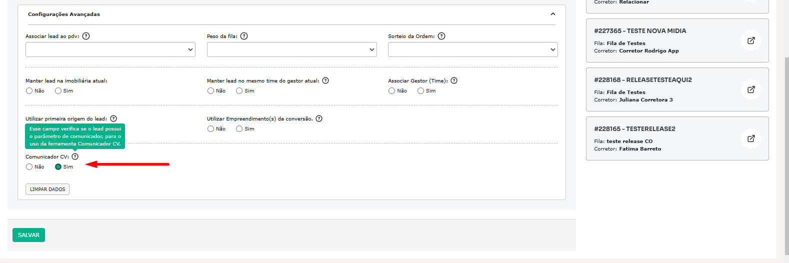 • O corretor precisa ter a flag de comunicação habilitada no CV CRM.