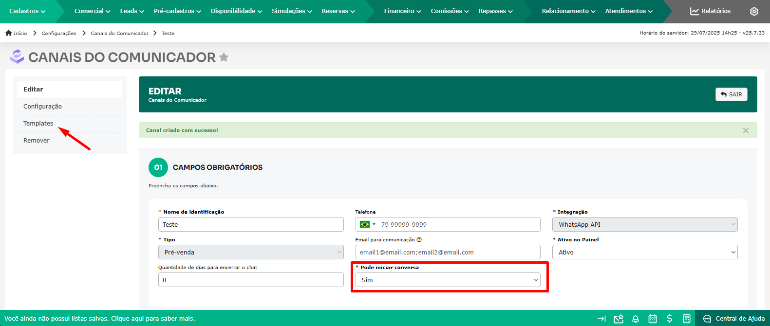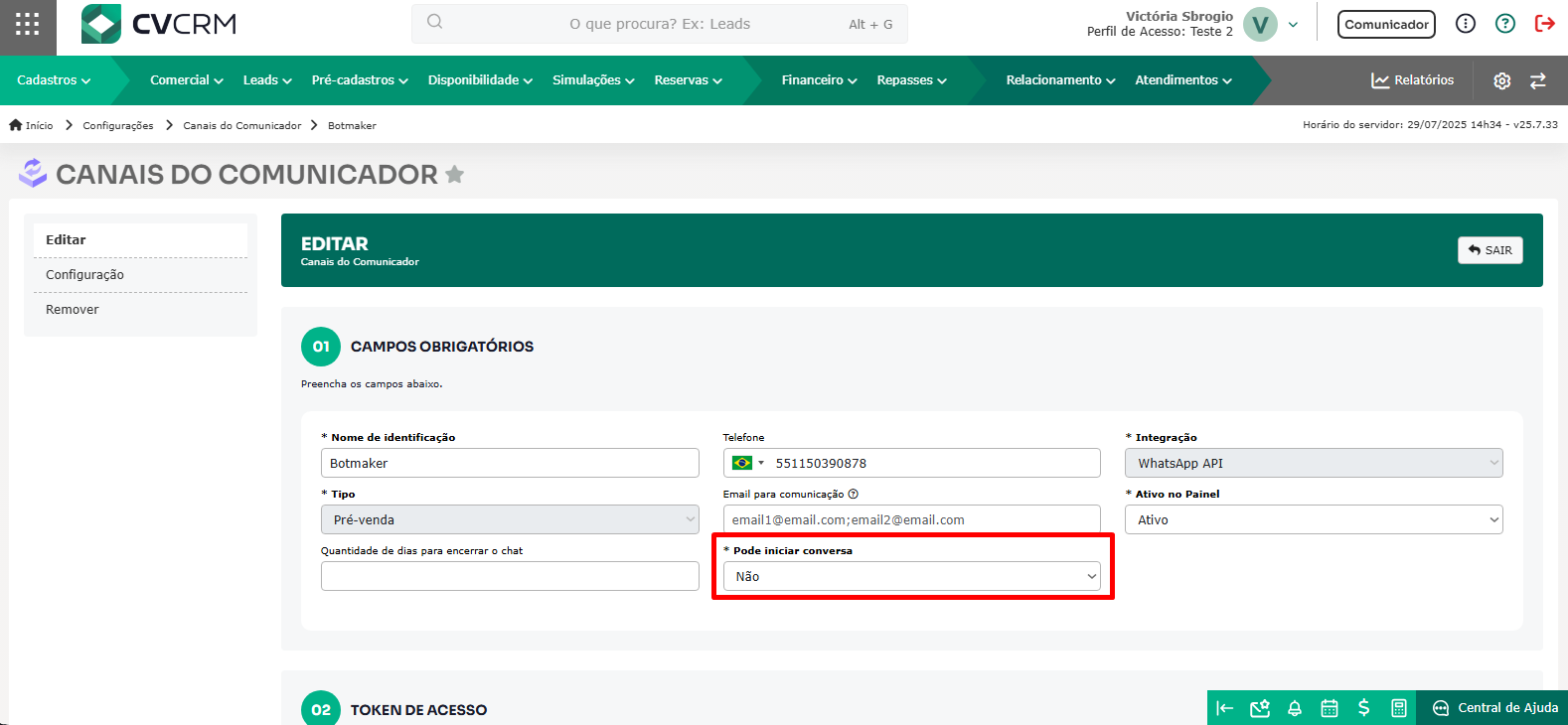 1. Verifique se o campo “Pode iniciar conversa” está como Sim.
