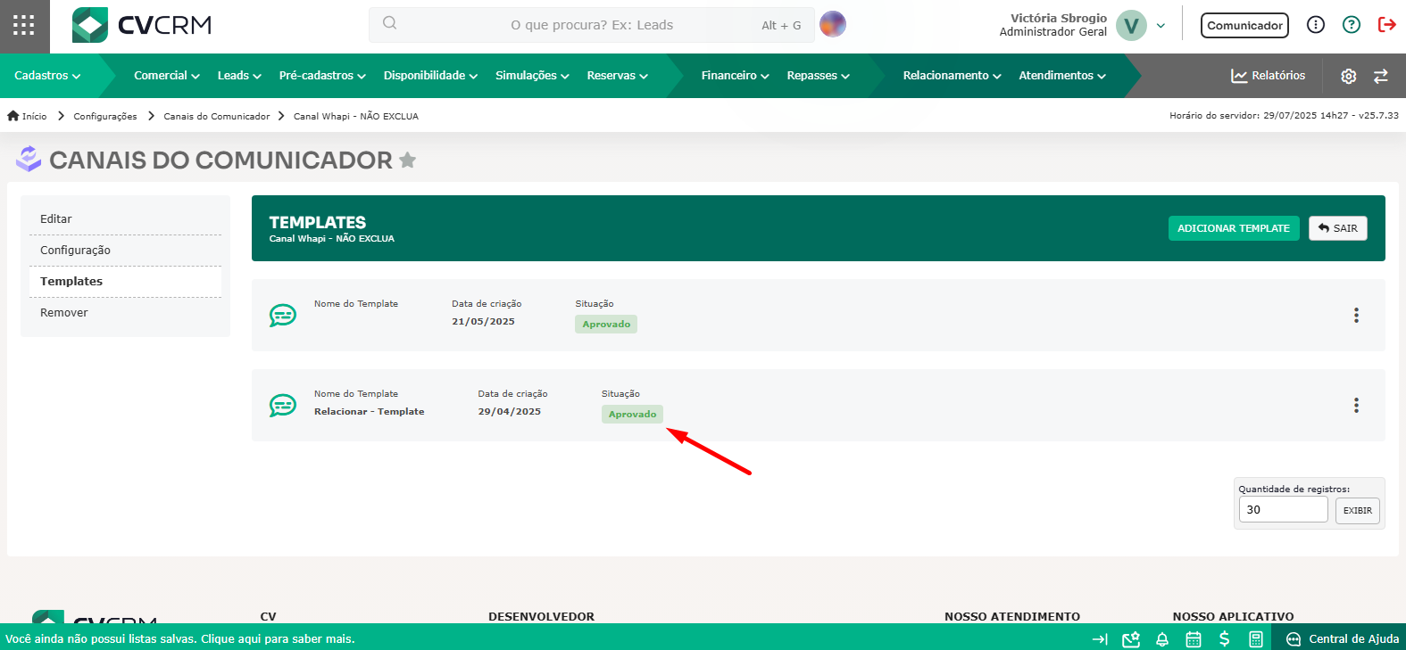 • O CV CRM, não é responsável pela aprovação ou bloqueio do número para com o WhatsApp