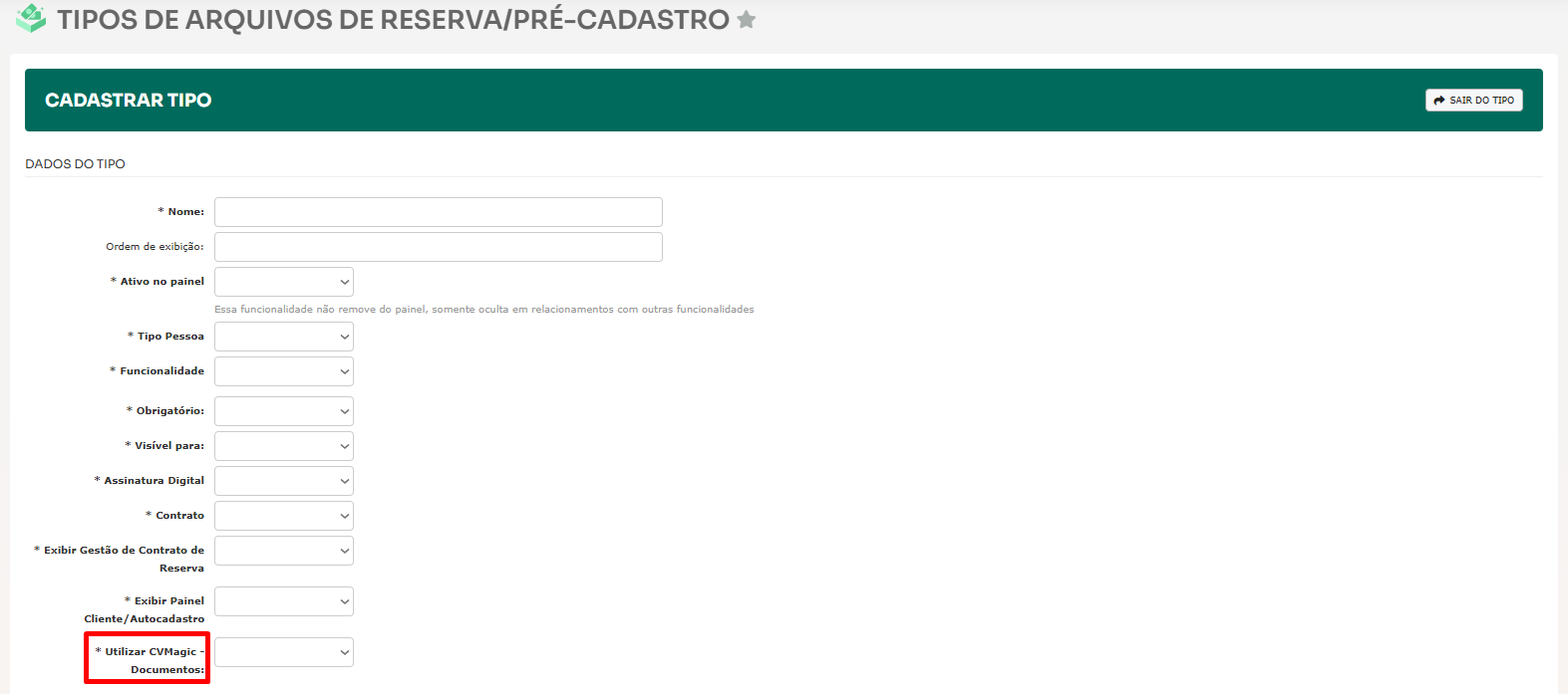 No cadastro dos "Tipos de Arquivos de Reserva/Pré-cadastro", há um campo que permite ao usuário utilizar o CV Magic | Documentos para um determinado tipo de documento. Por exemplo, se o tipo de documento Passaporte estiver configurado como "Não", o botão do CV Magic | Documentos não aparecerá na reserva/pré-cadastro para esse tipo de documento.
