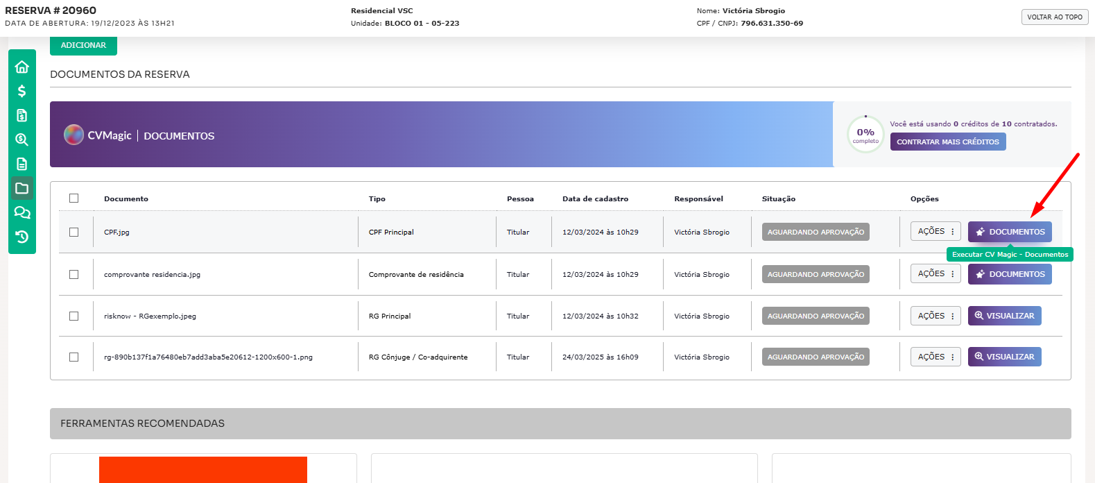 Com as permissões habilitadas, no menu "Documentos" da Reserva, você conseguirá visualizar e executar o CV Magic | Documentos.