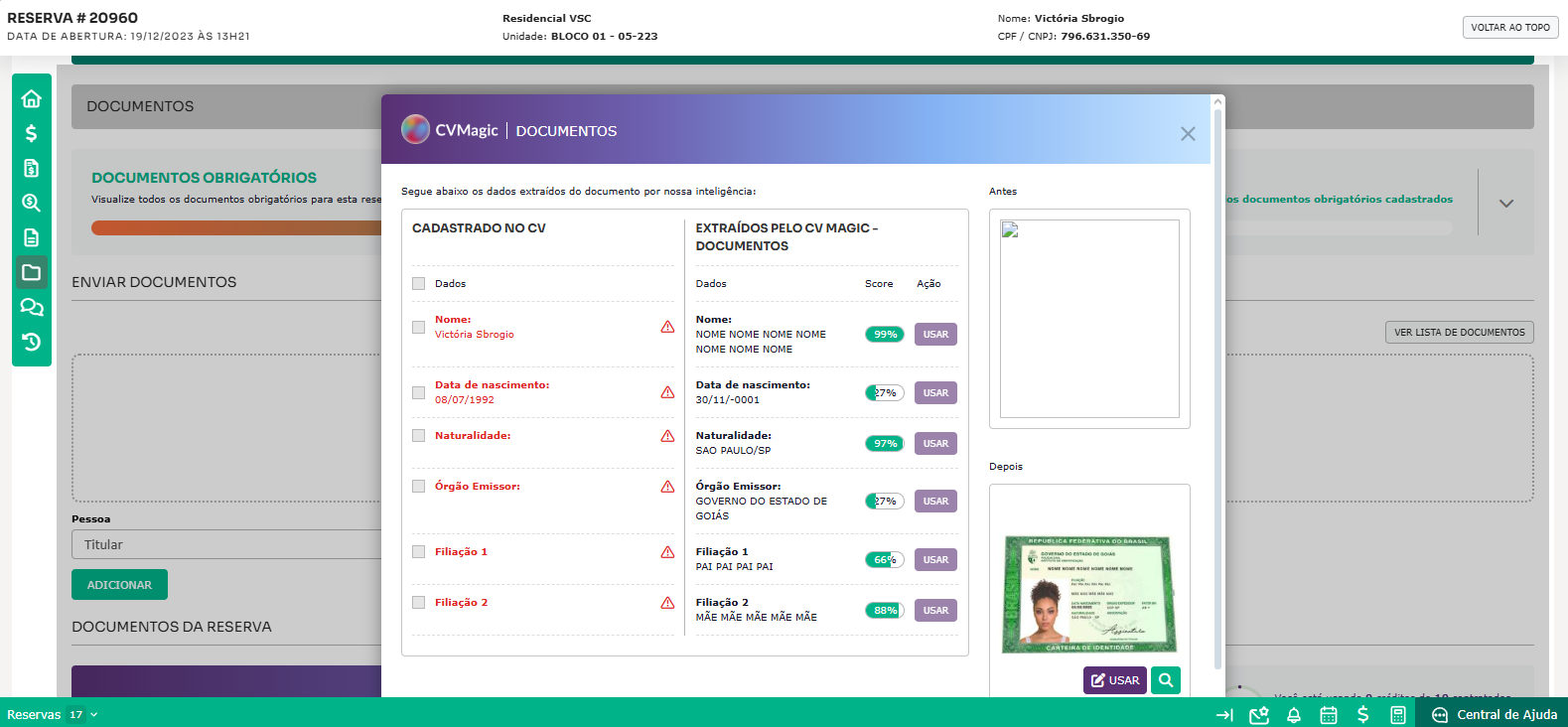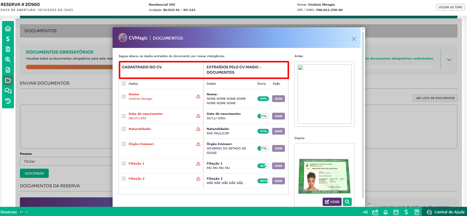 A ferramenta exibirá a imagem originalmente anexada (Antes) e a imagem editada (Depois), realizando ajustes de enquadramento. Assim, se o cliente enviou uma imagem invertida ou um pouco distante, o CV Magic | Documentos fará esses ajustes, permitindo que você visualize as versões Antes e Depois. Você pode optar por substituir a imagem original pela editada ao clicar no botão "Usar". Isso garante que, ao baixar os documentos, a versão atualizada da imagem seja incluída automaticamente. A imagem pode ser ampliada na tela ao clicar na lupa.