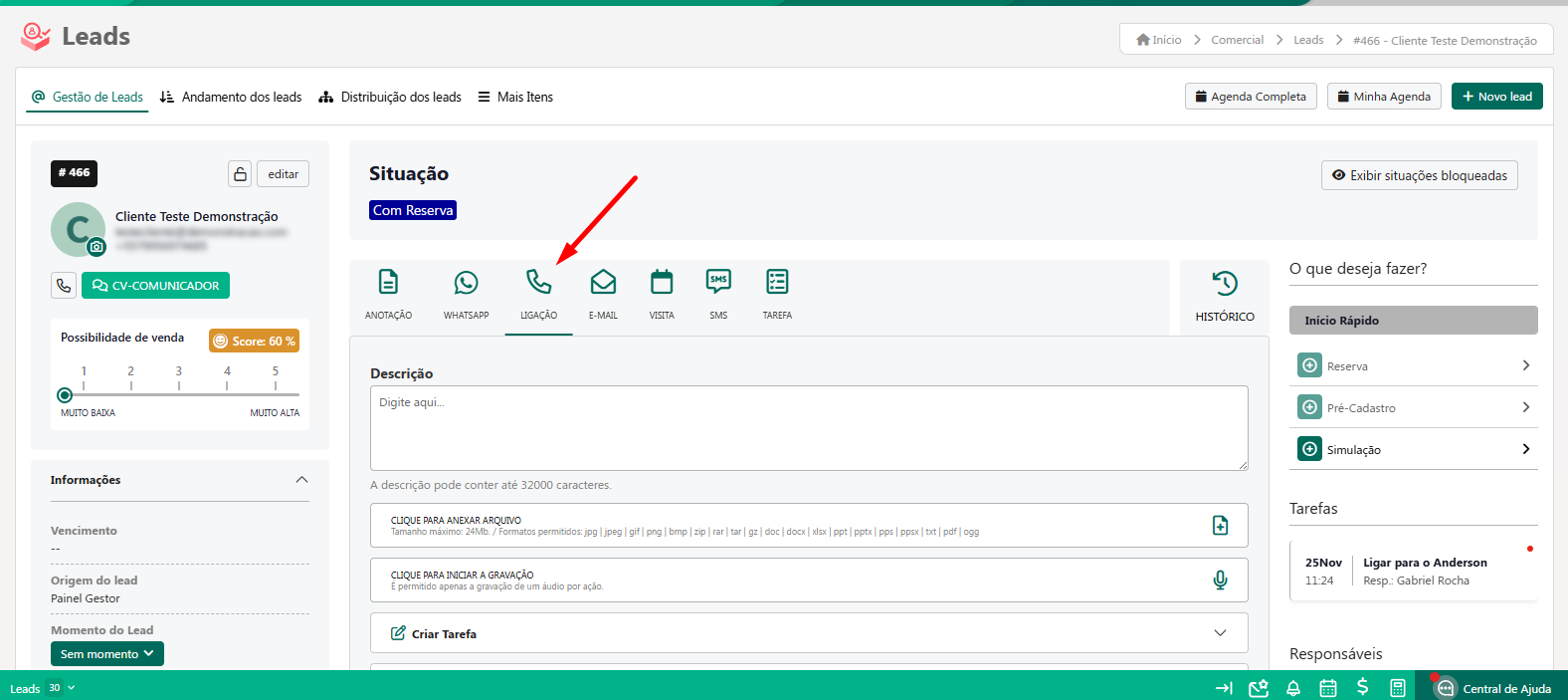 Como dito, podemos cadastrar tarefas dentro de todas as interações. Seguindo nosso exemplo acima, vamos criar uma tarefa em "Ligações".