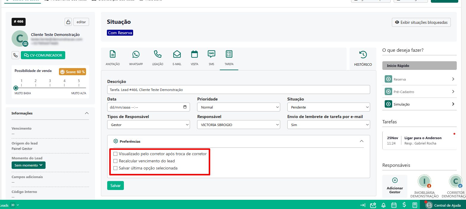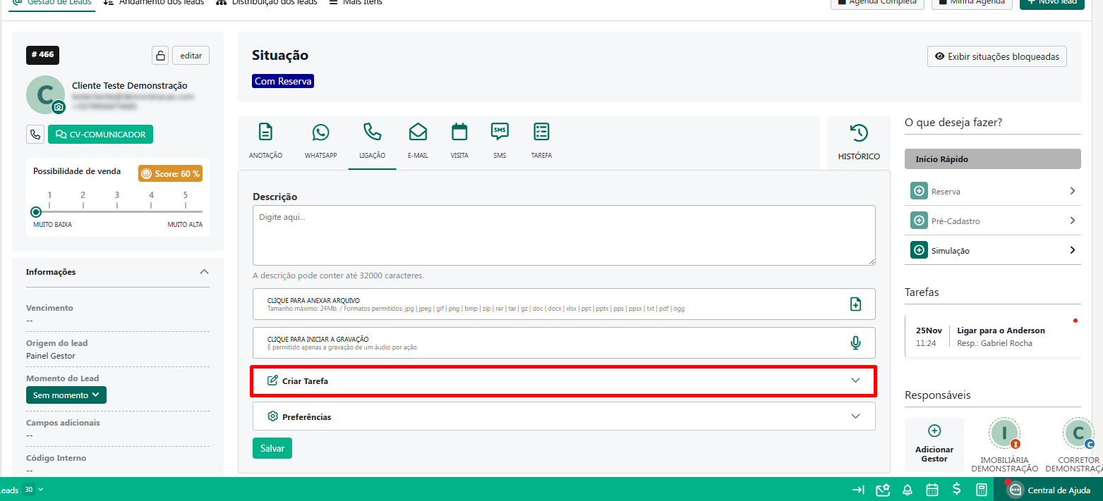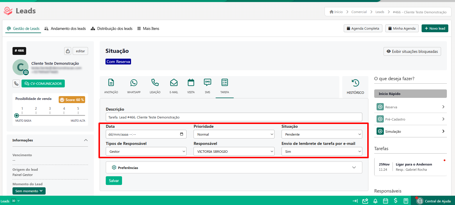 Cadastro de Tarefas no Lead - Painel do Gestor