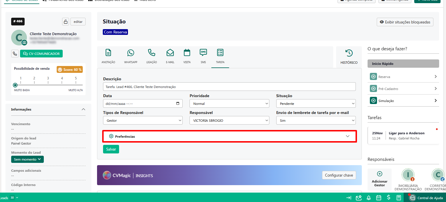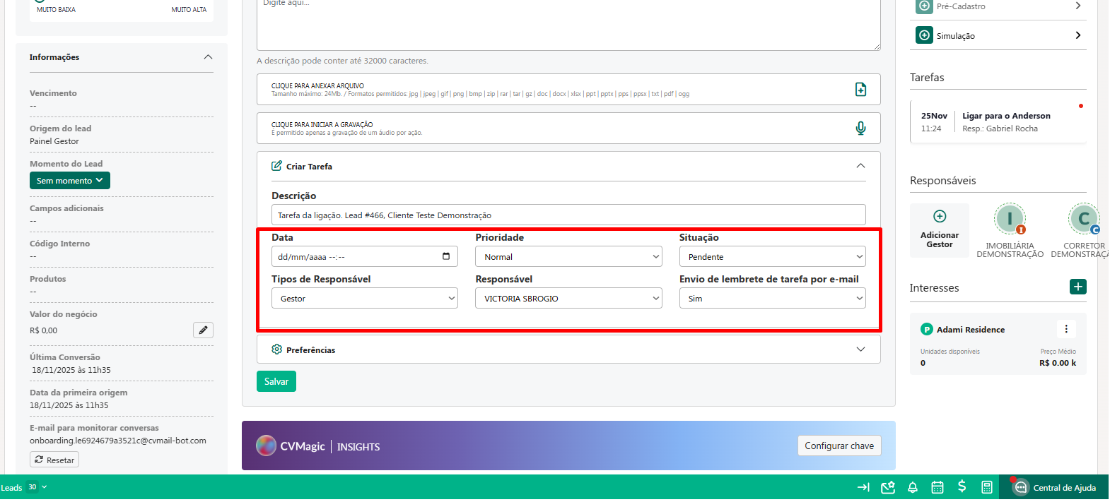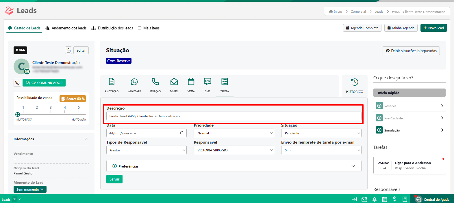 Cadastro de Tarefas no Lead - Painel do Gestor