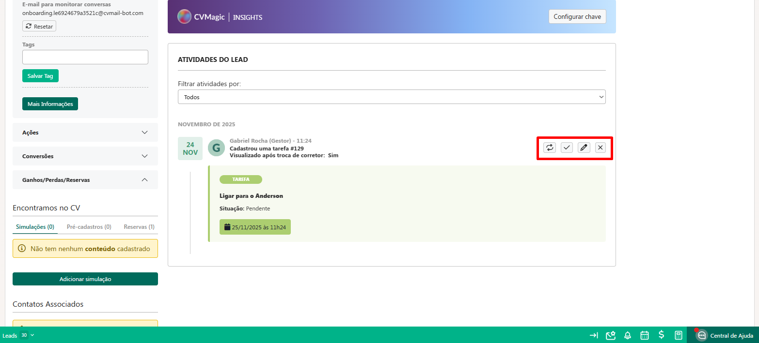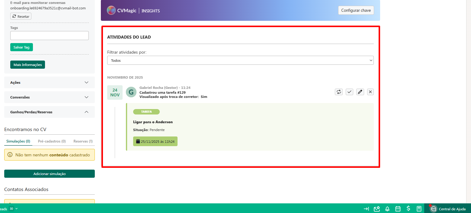 Ao salvar sua tarefa, ela ficará registrada nas "Atividades do lead".